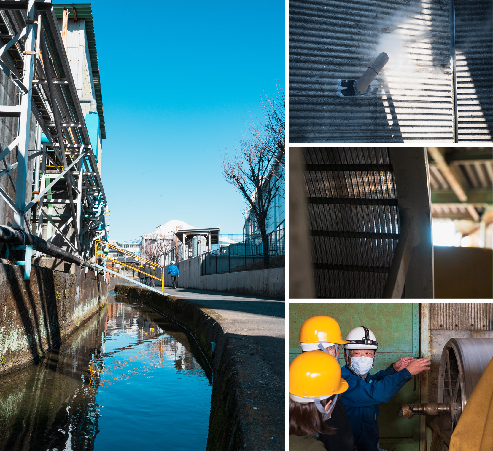 富士山と駿河湾を望む屋上から見える排水処理施設では、製造ラインで排出された水に含まれる汚染物質を微生物に分解させる「生物処理法」等により浄化処理が行われています。富士の紙づくりは「水から始まり、水に還る。」という、土地の環境に根差したものづくりでした。段ボールに押された赤い折り鶴マークは、そんな高い技術と環境配慮の上で製造された国産の証。これからは折り鶴マークを探して購入したいと思いました。
