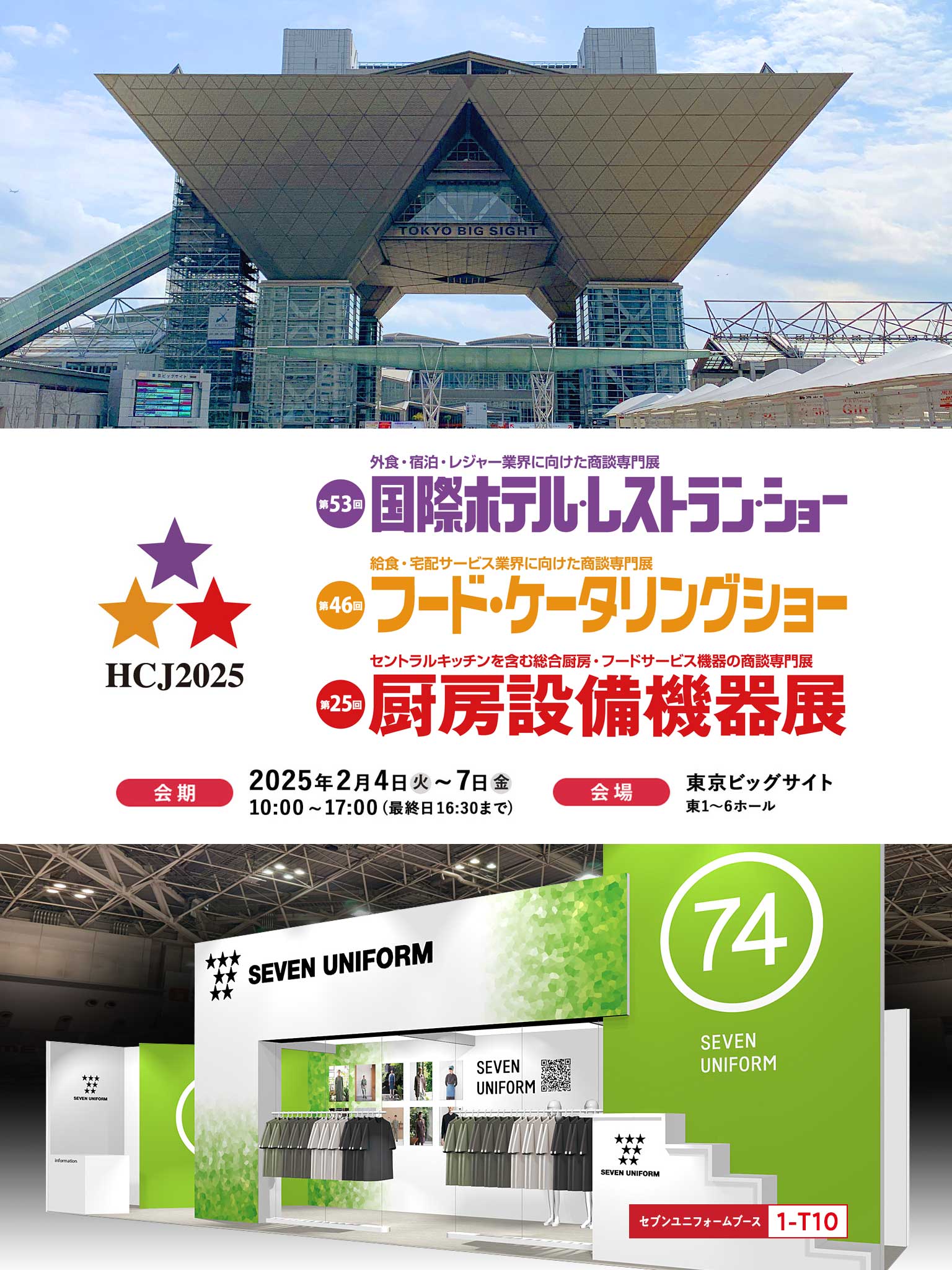 ユニフォームを通じて飲食・サービス業界の発展をサポートし、働く人々と共に歩み続けてきた私達セブンユニフォームは、進化し続ける飲食・サービスの最前線へ新しい機能・デザインのユニフォームをご提供するため、今年も「HCJホテレス」へ参加させていただきます。
