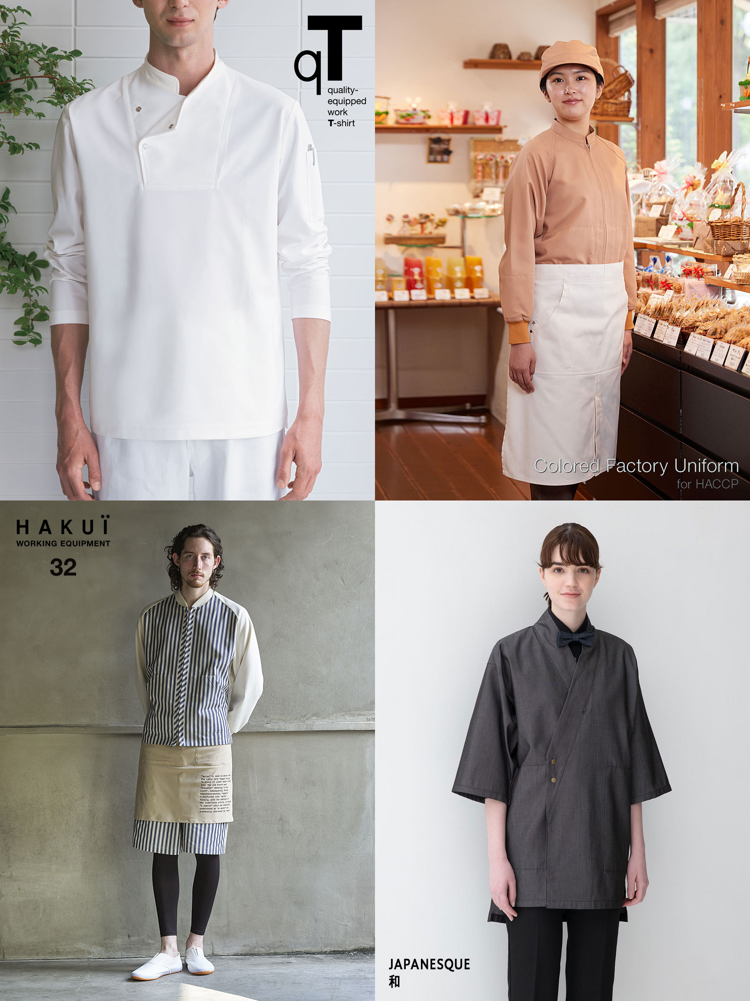 その他にも、飲食・サービス業界のための弊社の人気アイテムと、様々なコーディネートの展示をご用意しました。海外やファッション界からも注目の集まる、小野塚秋良デザインのWORKING EQUIPMENTブランド「HAKUÏ(ハクイ)」の最新作や、訪日外国人向けとして人気の和モダンなユニフォームなど、飲食・サービス業界の “今” に対応する商品群による新しいコーディネートを多数ご紹介します。
