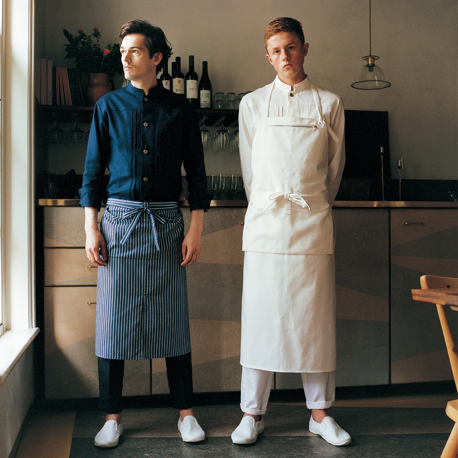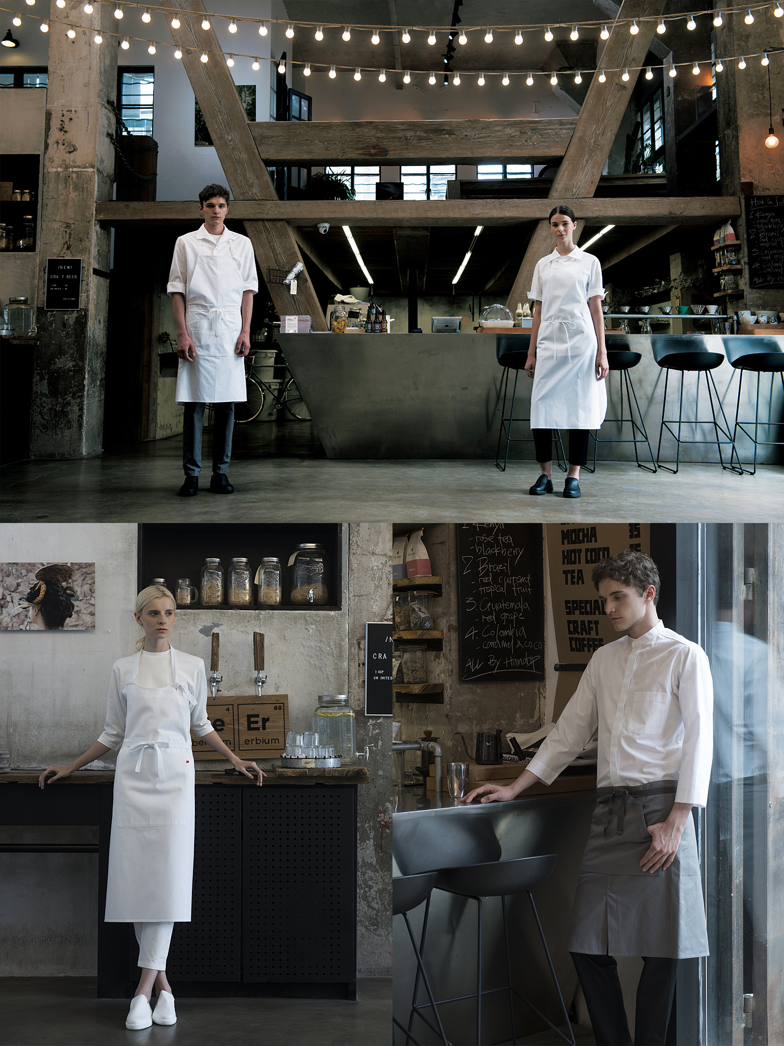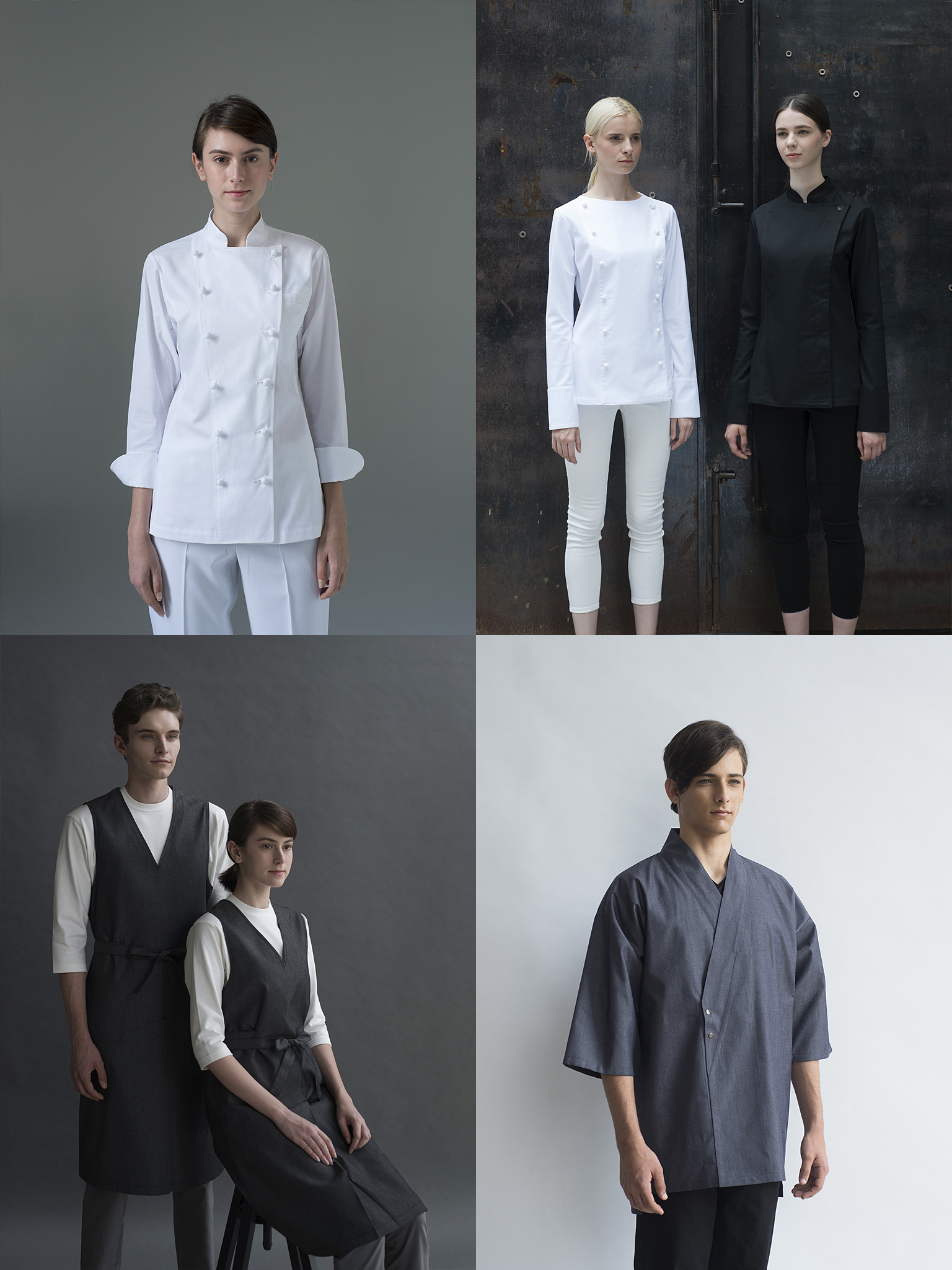 急増するインバウンド需要に合わせて、観光客向けのサービスやおもてなしが求められるようになったビジネスホテルや、少人数スタッフに様々な対応が求められる中・小規模のホテルでの業務シーンを想定し、2018年度新商品には、たった1枚でマルチタスクに対応可能な製品を多数ご用意しました。コートやベスト、エプロン、エプロンドレスは、スーツの上着やジャケットと着替えるだけで、フロントからウエイター、客室係、料理人、さらにホテル以外のお仕事まで、幅広く応用可能です。特にエプロンやエプロンドレスは、多様な職場や服装にマッチしやすいよう、落ち着いた色目を中心に3〜10色をラインナップ。そのほか、1枚だけで和の雰囲気を演出できる作務衣風コートや、女性向けを意識したスタイリッシュなカッティングのコックコートなどのユニークな新作アイテムも開発しました。