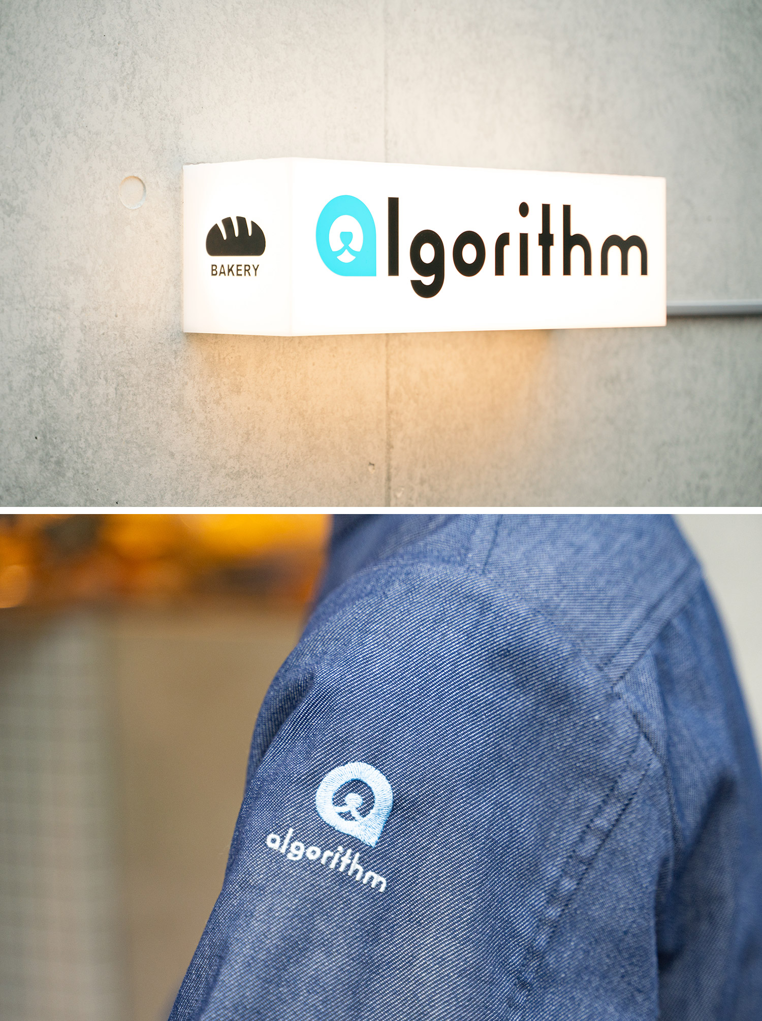「“無機物”のイメージであるコンクリートやガラスと“有機物”のイメージであるパンのコラボレーションで新しい世界観を生み出すことを目標にしており、アルゴリズムという店名も“無機質”なイメージからです。このエリアは住んでいたこともあるので馴染みありました。 “有機物”の樹木があり、季節の移り変わりが感じられる場所に出店したいと思って物件を探していました。ロゴにはアルゴリズムの“a”と初期段階で検討していたキャラクターのクマの鼻を組み合わせています。これはどこの媒体にもまだ公表していないので、気づいてもらえたら嬉しいですね。」