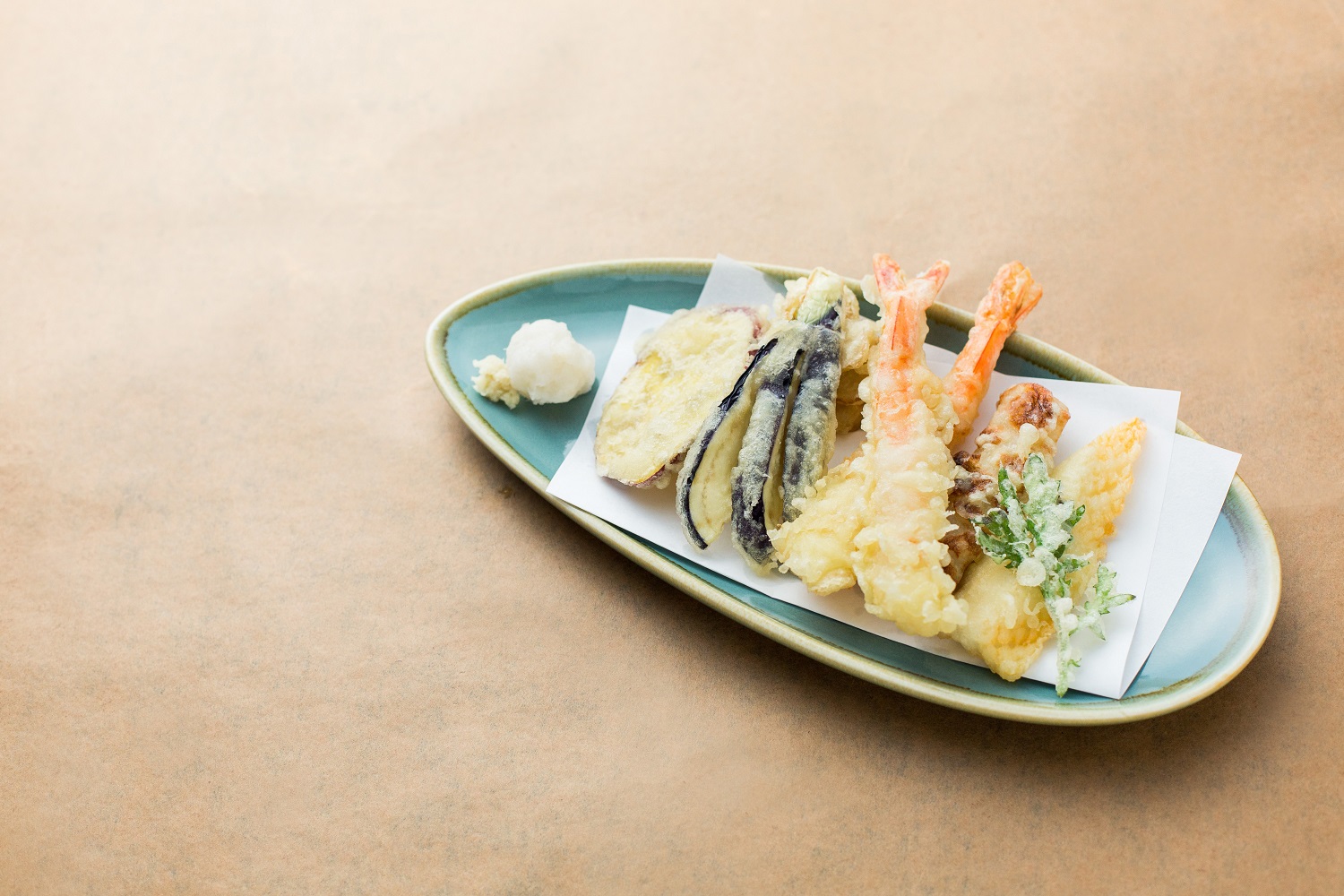 「おうどんと天ぷら中心の和食のお店ですが、コテコテの和ではなくモダンな感じも欲しいと思っていました。幅広い年代のファミリー(従業員)が働いてくださることが決まっていましたので、年代問わず着られ、和のテイストで、カジュアルな感じもある、というイメージからネイビーのダボシャツを選びました。紺と墨黒の2色から好きなほうを着用する案もありましたが、ご提供する器の藍色に合わせて、ユニフォームも藍色でまとめています。」と、ユニフォーム選びについてもお話してくださいました。