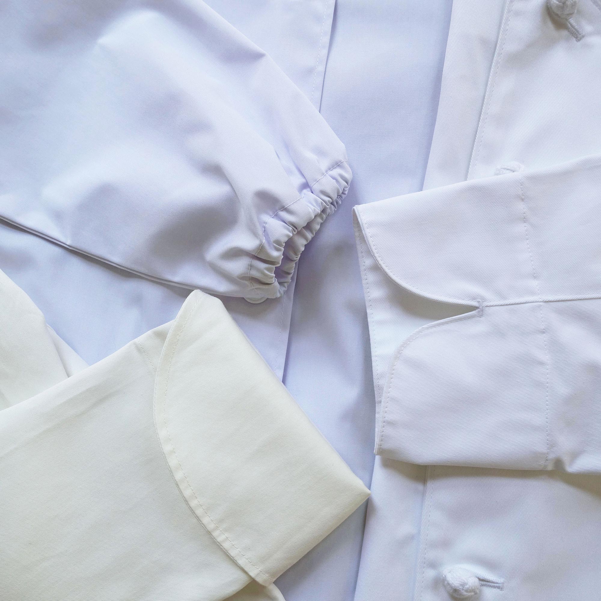 多くは食に携わる職種向けの白衣やコートに用いられ、弊社の商品の中でもいくつも使用しています。蛍光色の様に青白く光るような蛍光晒の白は、元々は「しっかりと洗濯され衛生が保たれている」ということを一目で表わす色として広く活用されてきました。例えば給食の白衣や和の白衣、研究職用のカウンセラーコートなどがその白を用いています。