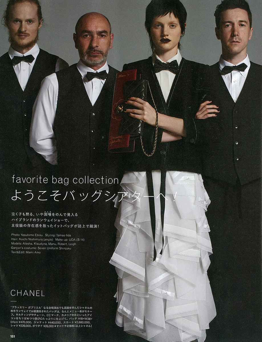 今号のバッグ特集「BAG! BAG! BAG!新しいバッグを買いにいこう」のコーナー記事「ようこそバッグシアターへ!」では、エルメスやルイ・ヴィトンなどハイブランドの、ランウェイショーに登場したイット・バッグを特集。高級ブランドの旬のバッグの数々が紹介されるこのコーナーの最初のビジュアルとして、ハイセンスなレストランのスタッフを思わせるセブンユニフォームの制服を纏ったモデルと共に、シャネルのバッグを撮影。誌面を優雅に演出しています。