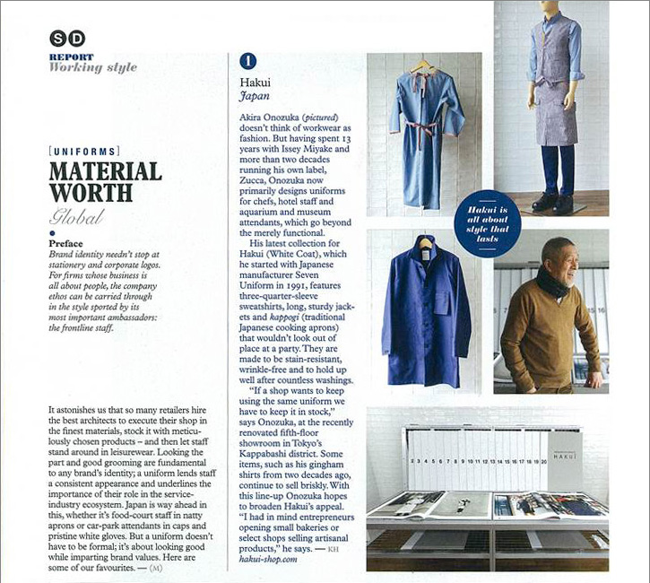 世界情勢から、様々な国のビジネス、カルチャー、デザインまでを取り扱う、イギリスのグローバル情報誌「MONOCLE 4月号」に、小野塚秋良氏デザインのワーキングユニフォームブランド「HAKUÏ(ハクイ)」の紹介記事が掲載されています。