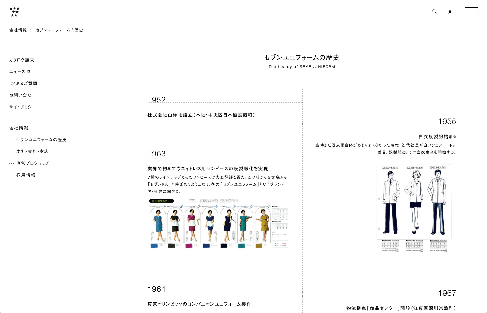 コーポレートサイトとしての会社情報充実を図り、歴代のカタログビジュアルやエピソードも加わった沿革「セブンユニフォームの歴史」や、ご来店してご購入いただける直営ショップの情報も掲載。また、今までに頂いた『よくあるご質問』へのアンサーをご用意しました。もちろんWebフォームからカタログ請求・商品についてのお問い合わせも可能です。
