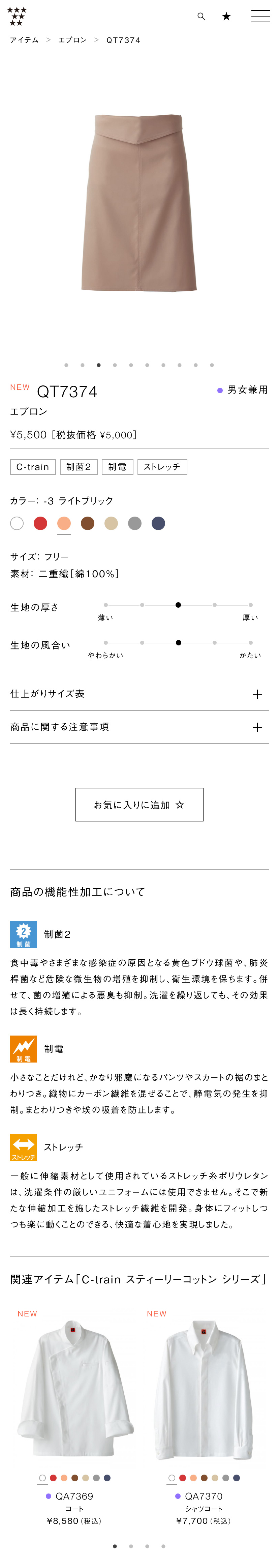 各商品のページには、商品写真、サイズ、価格、生地や機能についての解説など、商品の詳細な情報を掲載しています。