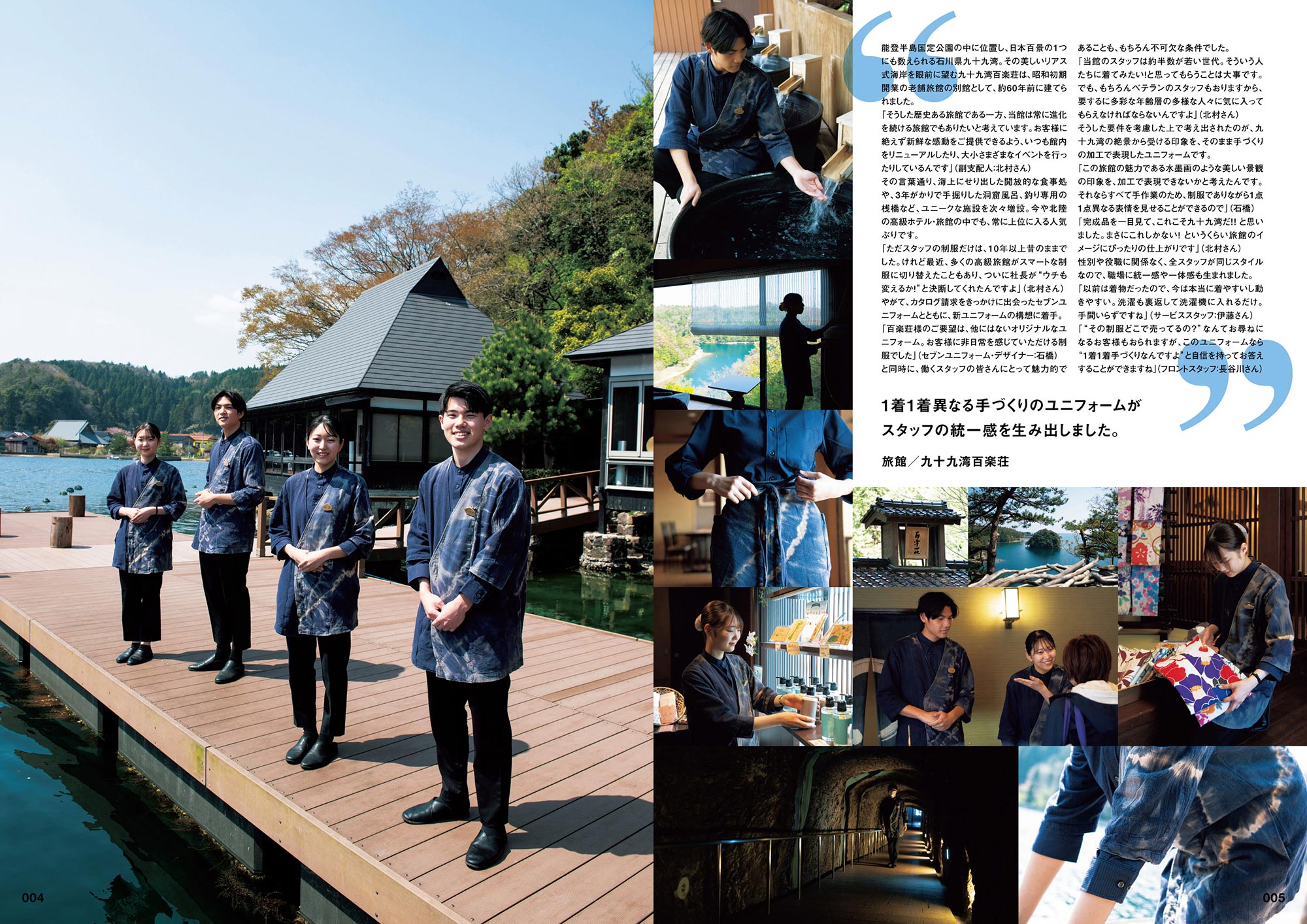 今回は、石川県九十九湾の美しいリアス式海岸を眼前に望む、その絶景をユニフォームに表現した人気旅館「九十九湾 百楽荘」、創業70周年の老舗メーカーながら新しいチャレンジを続ける、広島銘菓・もみじ饅頭「御菓子司 にしき堂」、天然の香りを用いた空間演出で、ホテルや公共施設、ショップなどをコンサルティングする「アロマ空間デザイン @aroma(アットアロマ)」、建設業の根幹をなす、多種多様なインフラ設備で地域の暮らしと産業を支える、設備工事のエキスパート企業「設備工事 セイフル株式会社」の4カ所を訪問し、お仕事やユニフォームへの想いをお聞きしました。