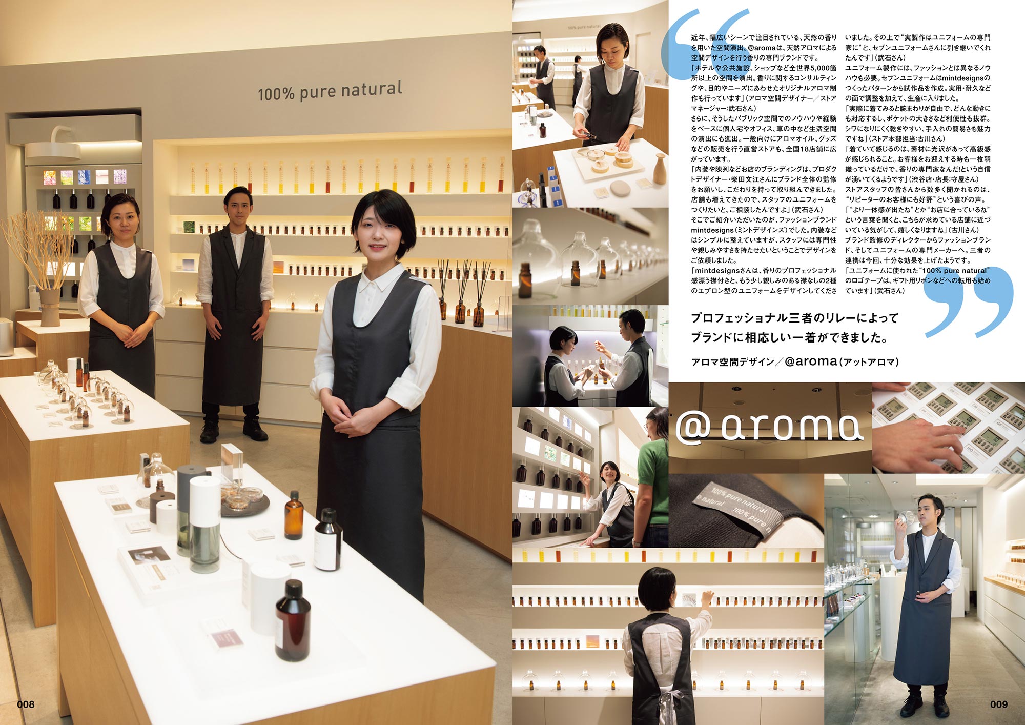 巻頭の「現場レポート」では、ユニフォーム姿で働くスタッフの方々にインタビュー。ユニフォームはそのお店や会社のコンセプト・イメージを表現する大切なアイテムの1つです。そこに込められる意図や思いはそれぞれ違い、複雑に交じりあいます。そのユニフォームはどんな思いで作られ、何を表現し、働く人が何を感じているのか。あるいはどのように業務の問題点を解決したのか。様々なユニフォームの可能性は、お客様の数だけあると考えています。