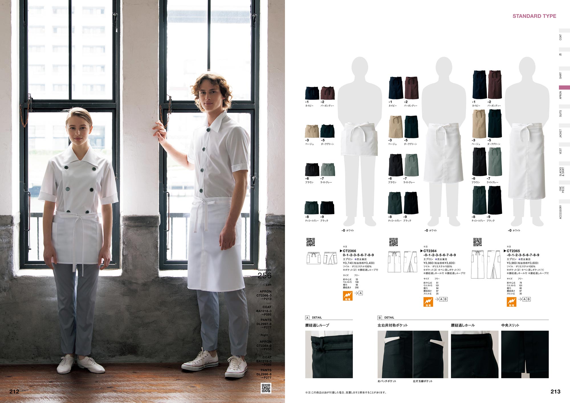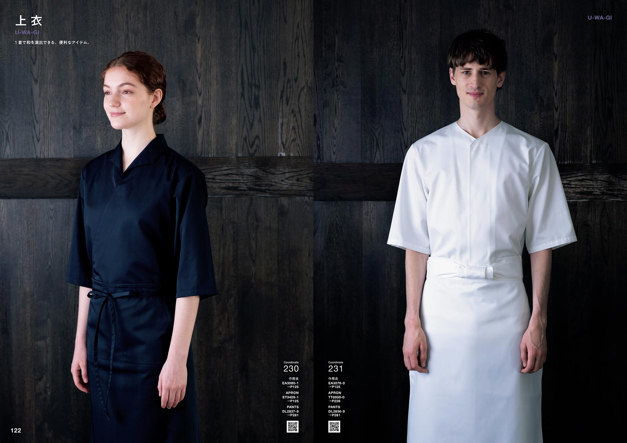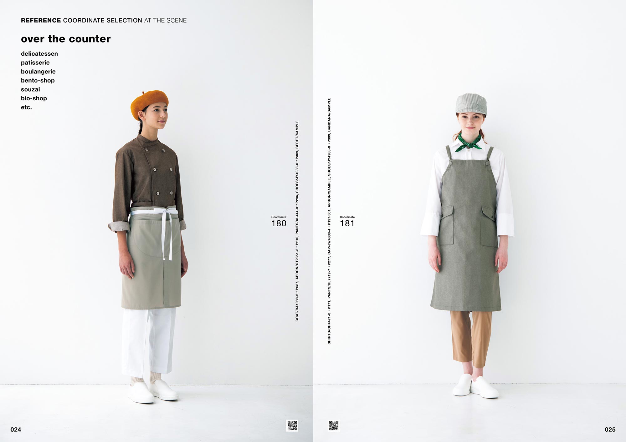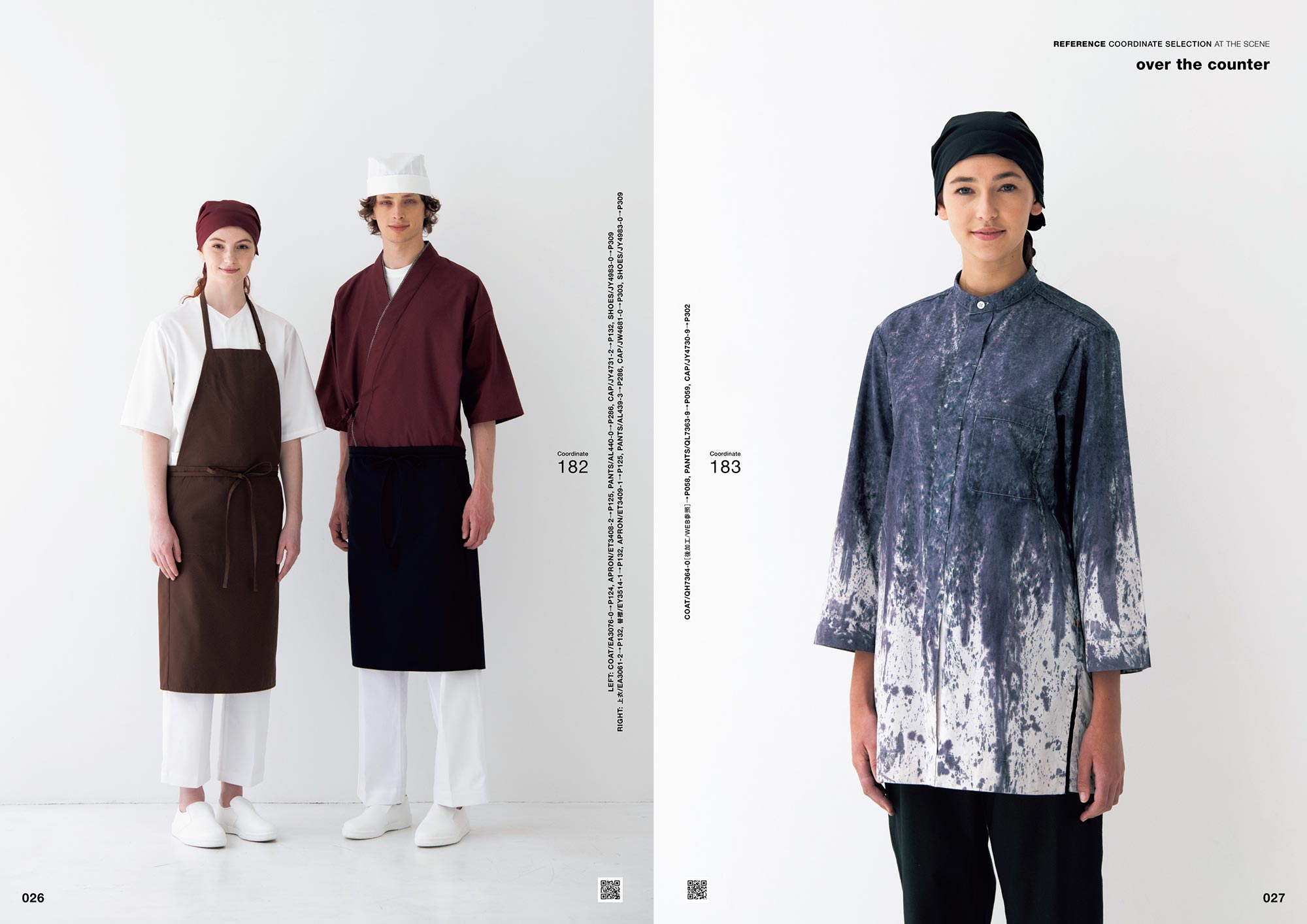 それぞれのコーディネート写真のQRコードから「Webカタログ」へアクセスしていただくと、各着用商品の詳細な情報を簡単にご覧いただけます。新しい施設や店舗でのユニフォームイメージの検討資料としてご活用ください。