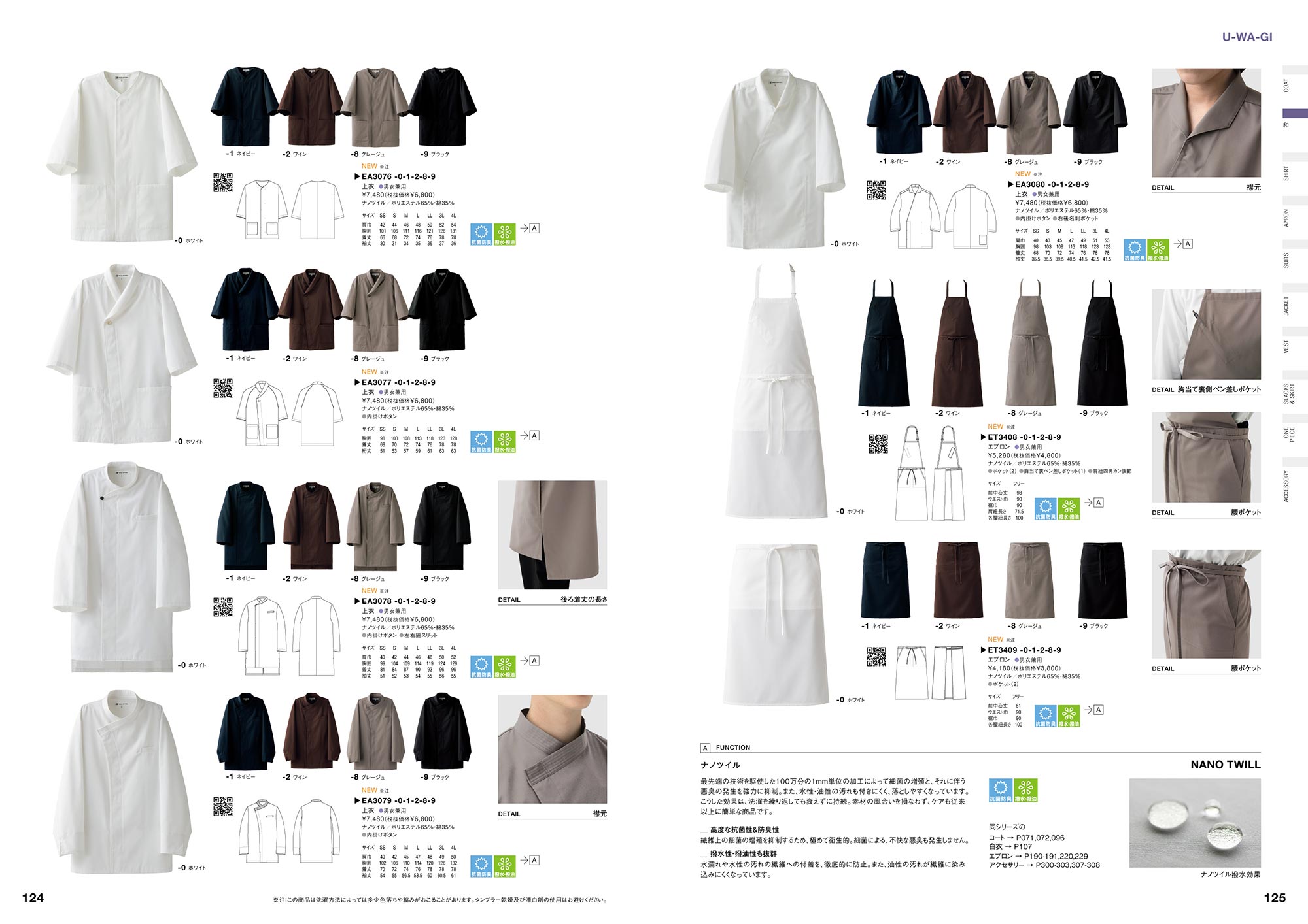 主に着用時に表現のメインになる衿、色の2つのポイントに注力。生地には細菌の増殖と悪臭の発生を強力に抑制する、抗菌生地「ナノツイル」を使用した和装上衣とエプロンを展開するシリーズ。和風なナチュラルカラーのバリエーションをご用意し、トータルコーディネート含め新しいモダンな和のスタイルを提案します。