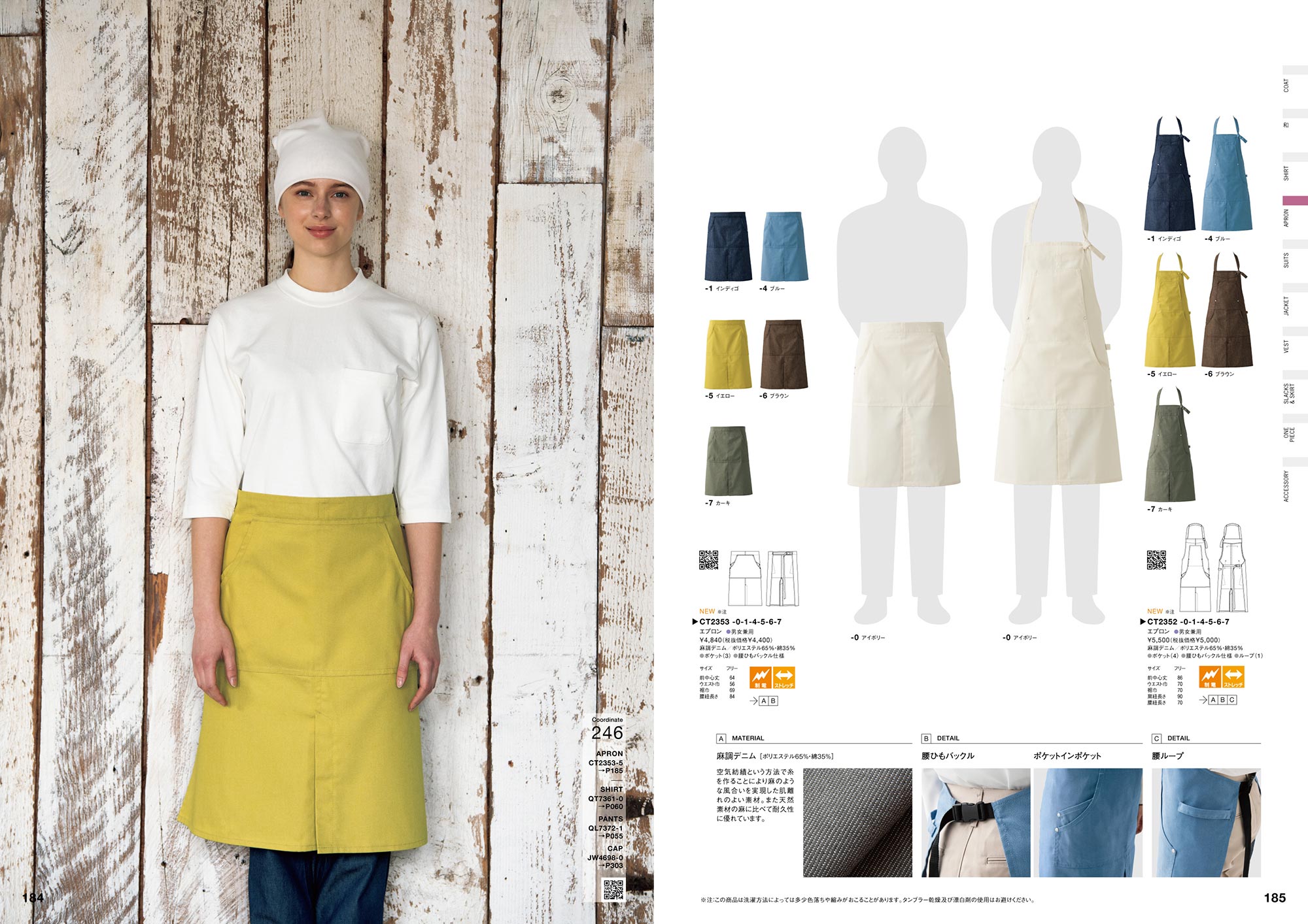 ザックリとした着心地と丈夫な耐久性が人気のデニム生地に、カラフルなバリエーションをご用意し、コート、ベスト、シャツ、エプロンを展開するシリーズ。空気紡績という方法で糸を作ることにより麻のような風合いを実現した肌離れのよい素材です。ポリエステルと綿の混紡糸で出来ているので通常の綿100%デニムの経年劣化による色落ちや生地が痩せるなどがほとんどなく、いつまでもキレイなデニムのままでのサービスが可能。また麻調の風合いながら天然素材の麻に比べて耐久性に優れています。
