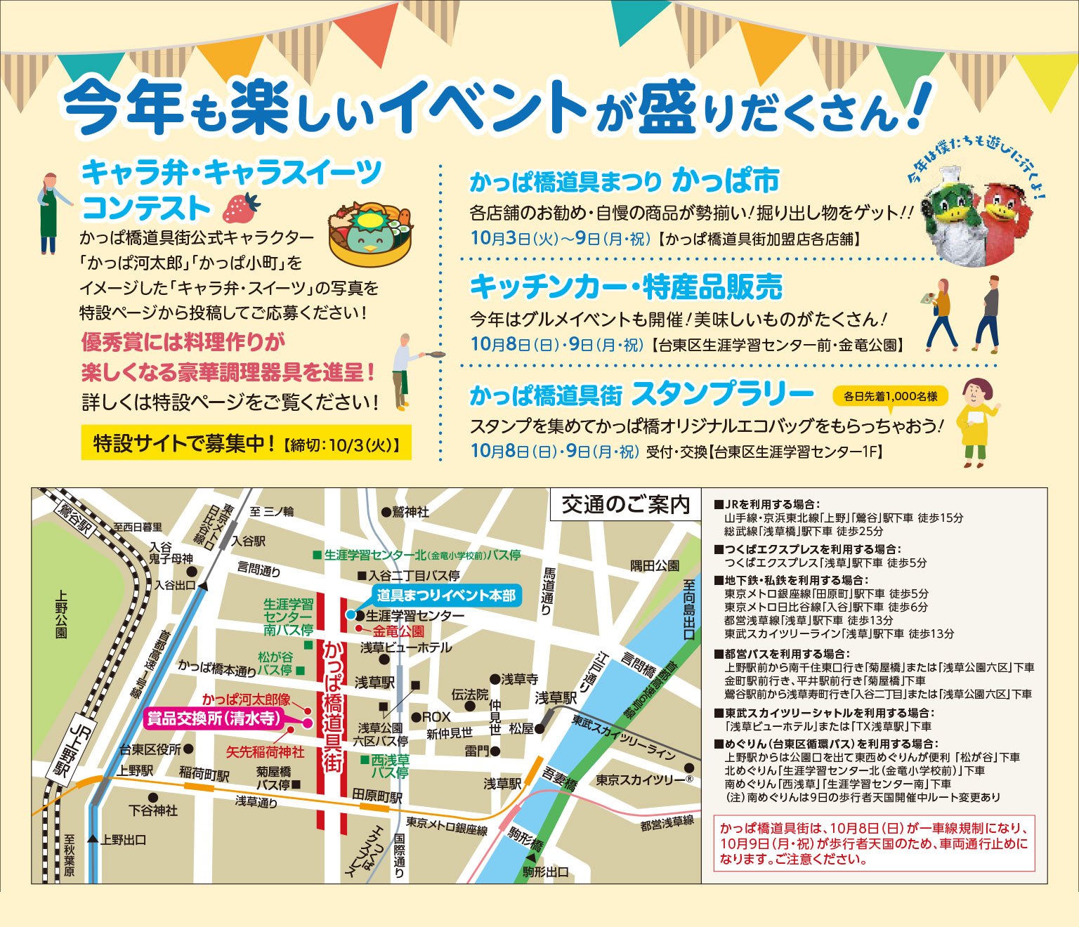 特に週末の8日(日)・9日(月・祝)は、大人から子供まで楽しめるさまざまなイベントやパレードも開催! 美味しいものが集まる「キッチンカーや特産品販売(10:00~17:00 台東区生涯学習センター前・金竜公園)」のほか、「キャラ弁・キャラスイーツコンテスト展示会(10:00~17:00 台東区生涯学習センター1F)」や、かっぱ橋道具街のイメージキャラクター「かっぱ河太郎・かっぱ小町」が登場する「着ぐるみグリーティング(10:00~17:00 かっぱ橋道具街)」。スタンプを集めて景品がもらえる「かっぱ橋道具街スタンプラリー(10:00~16:30 受付・交換:台東区生涯学習センター1F)」にもぜひご参加を。