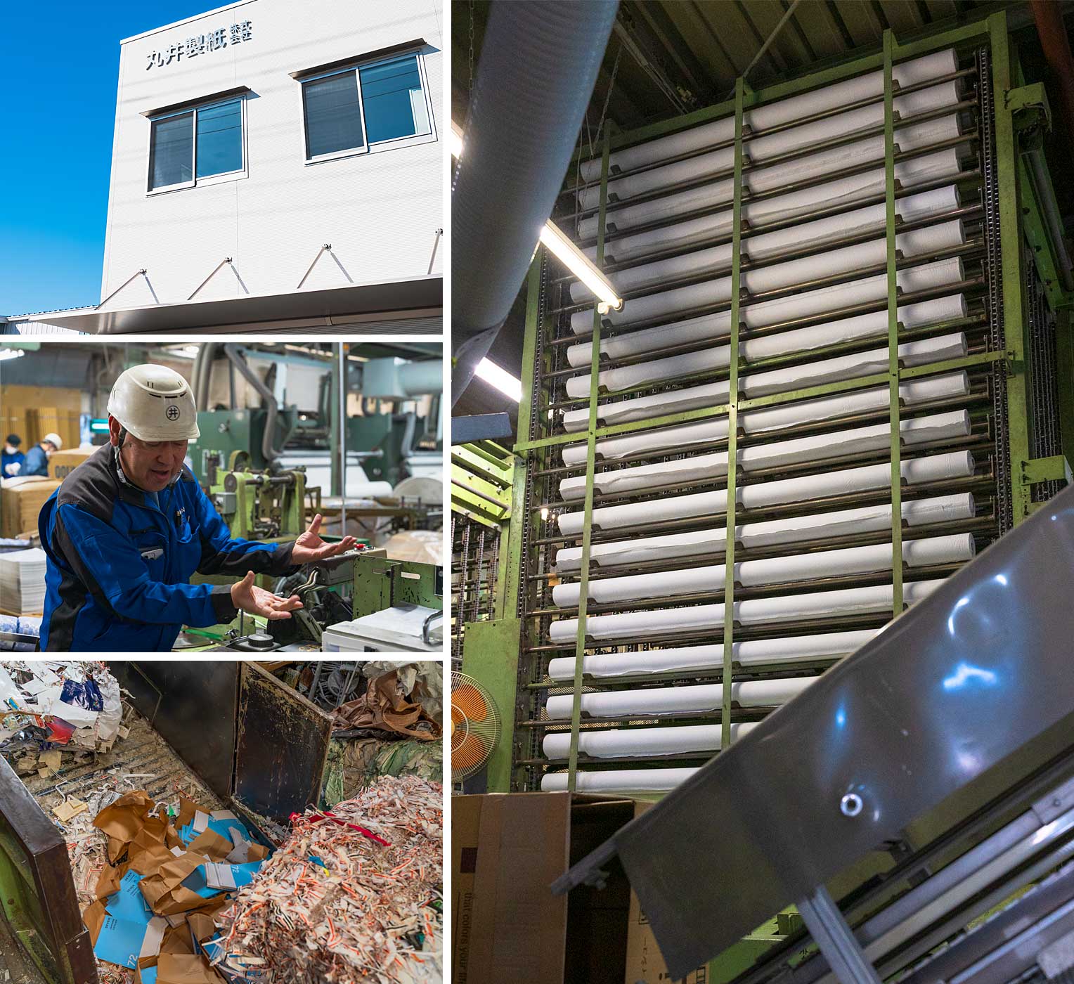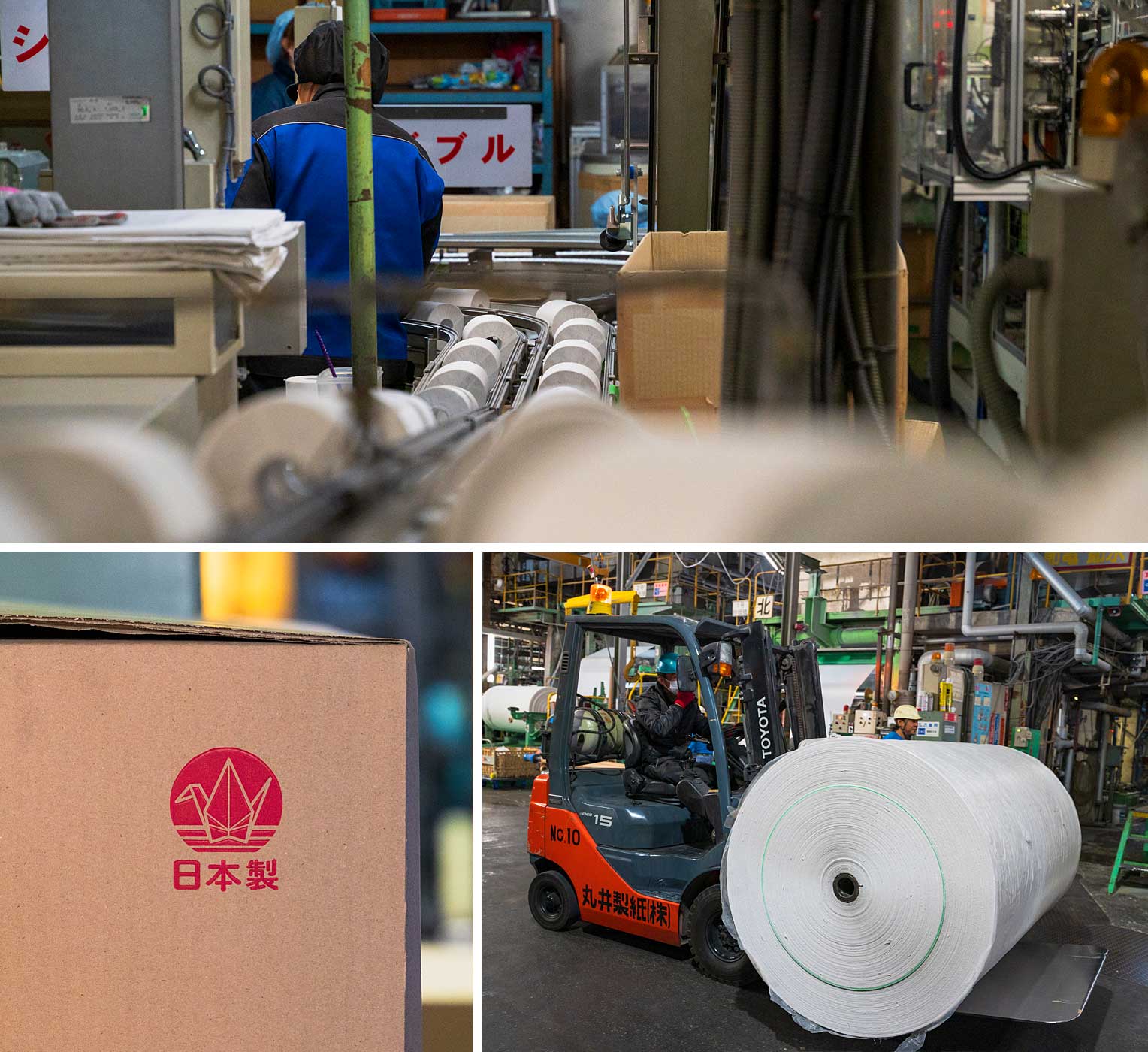 丸井製紙株式会社さまの古紙原料によるリサイクル率は、箱や台紙に使われる板紙が古紙90%弱、トイレットペーパーでは古紙100%だということです。リサイクル・トイレットペーパーといっても品質は高く、古紙の性質や使用目的によって出来上がる紙の薄さを調整したり、エンボス加工を入れたり…奥深くどこまでもお客さまのことを考慮し作られています。今回改めてお話を伺い、トイレットペーパーが古紙100%で作れるものなのだと、始めて知りました。
