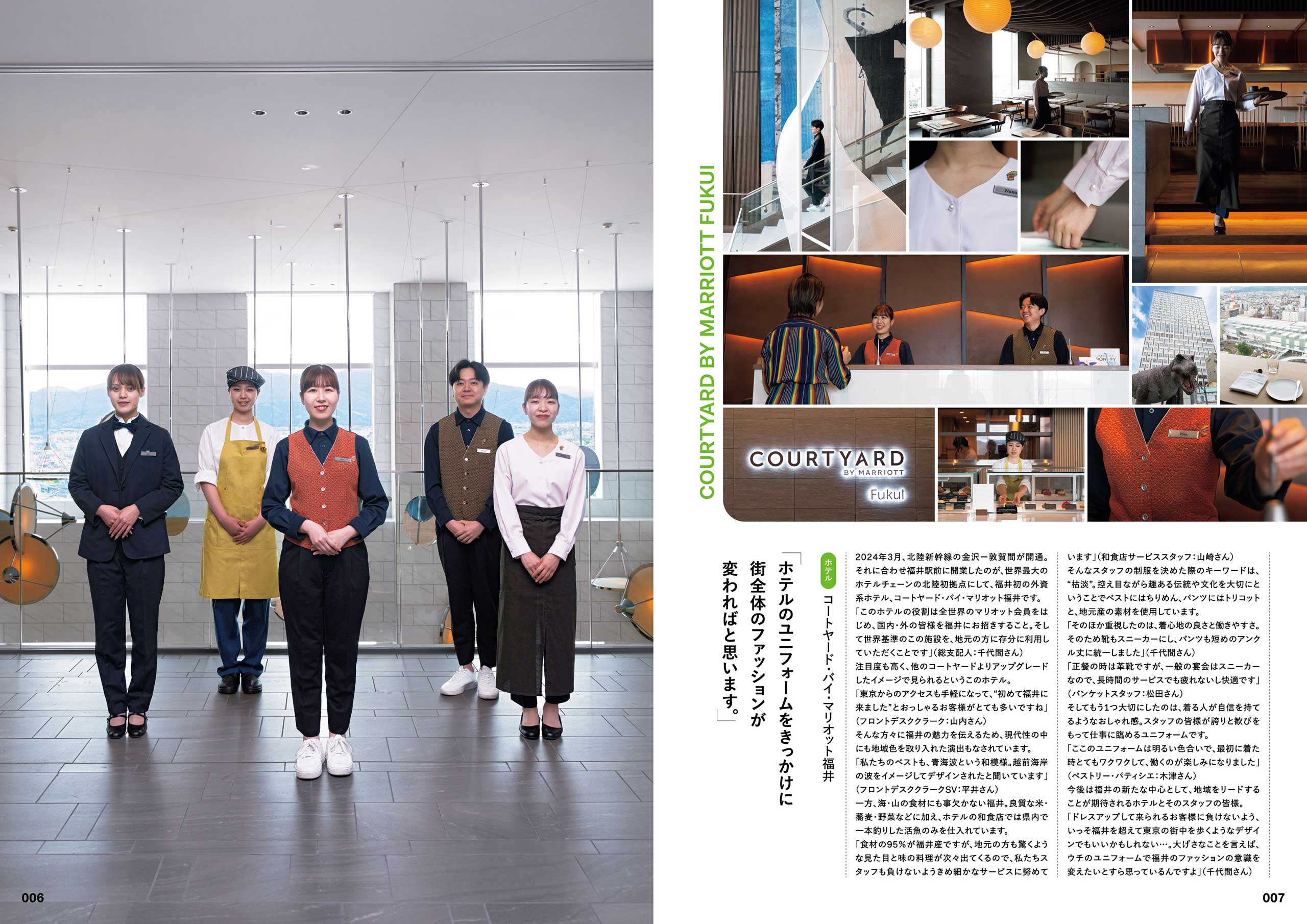 今回は、広大な緑あふれる広場で住まいと暮らしについて家族みんなで楽しみながら学べる、積水ハウスの体験型モデルハウス施設「トゥモローズ ライフ ミュージアム関東」。北陸新幹線の延伸開通に合わせ福井駅前に開業した世界最大のホテルチェーンの北陸初拠点となる、現代性の中に福井の伝統と文化を取り入れたホテル「コートヤード・バイ・マリオット福井」。東京の中心・港区に誕生した新たなランドマーク・麻布台ヒルズにオープンした、パティシエ手作りの世界で最も薄いチョコレート“コルテッチャ”を提供するチョコレート菓子専門店「MATTE(マッテ)」の3カ所を訪問し、お仕事やユニフォームへの想いをお聞きしました。