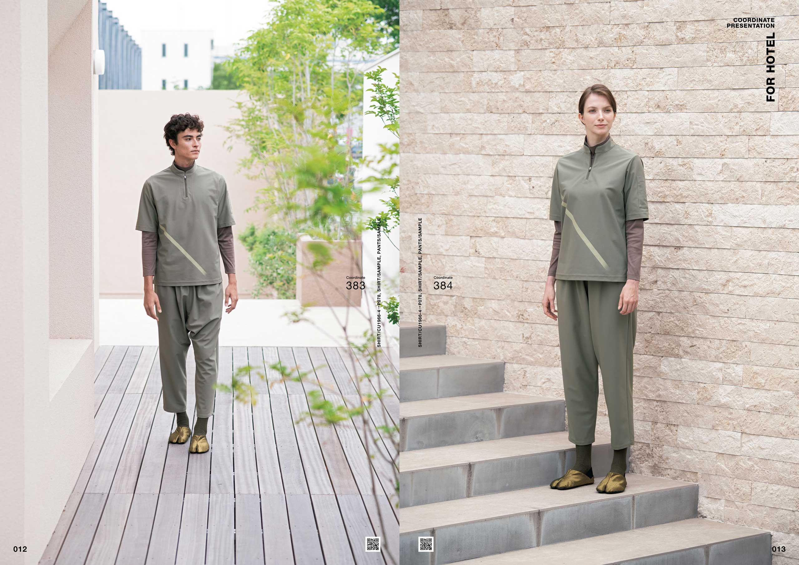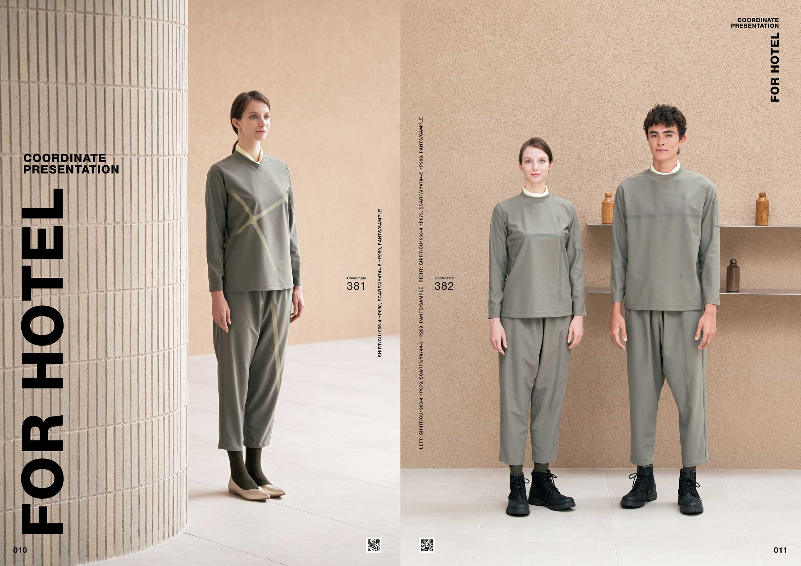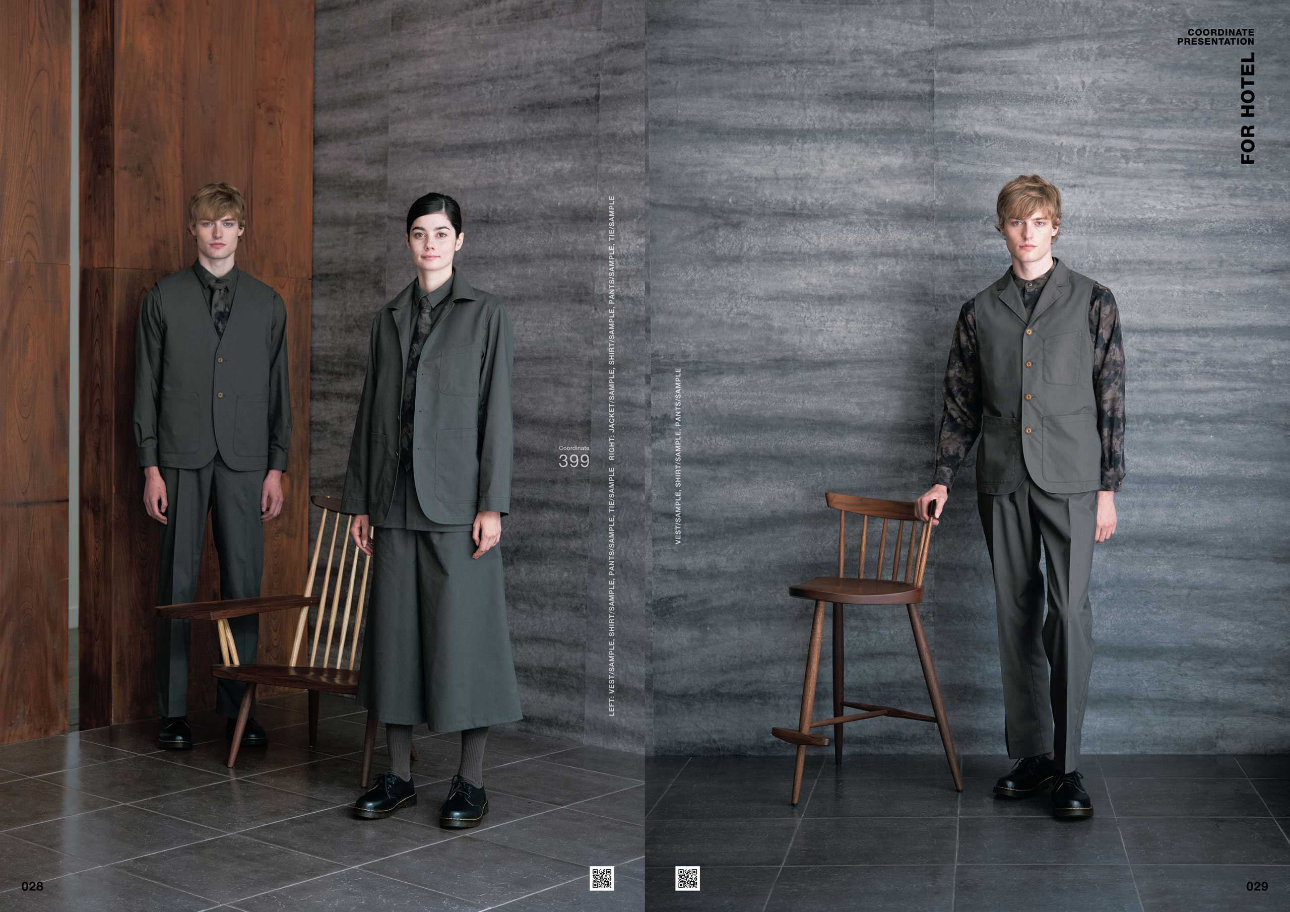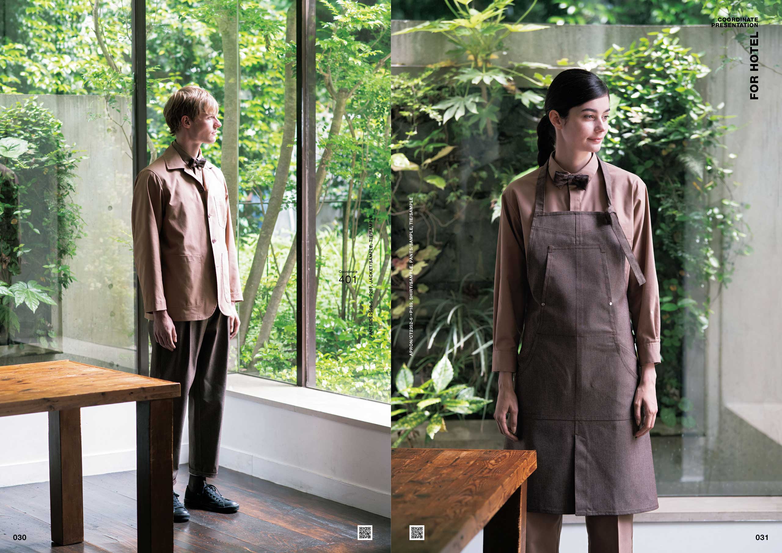 カタログの特集「COORDINATE PRESENTATION FOR HOTEL」では、今後エンドユーザから益々求められるであろう実際にあるホテルのコンセプトを元に、オーダーユニフォームや、既製品コーディネートの提案をしています。