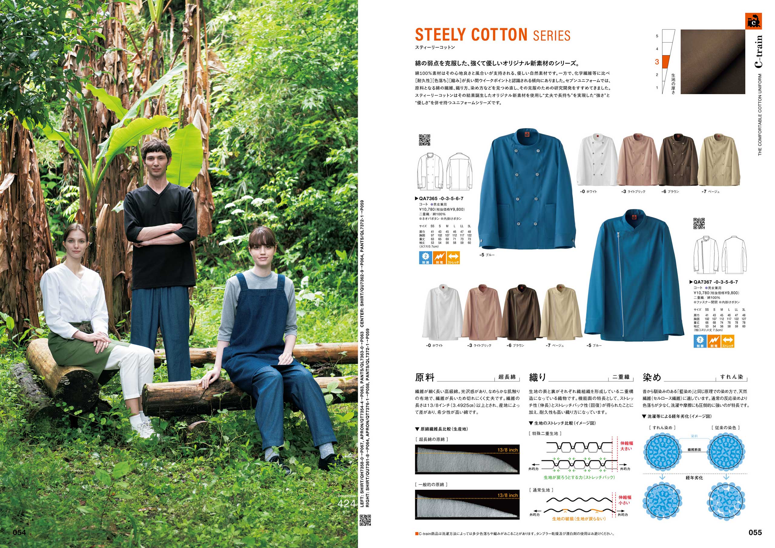 人気の製品では、耐久性の向上や色落ち・縮み防止など、綿製ユニフォームのデメリットを克服した新開発素材のシリーズ「Steely Cotton(スティーリーコットン)シリーズ」は、天然素材・綿100%でありながら、仕事着・ユニフォームに必要な丈夫さを備えた素材をオリジナルで開発し、時代の求める“心地良さ”と“強さ”にコットンのやさしさでお応えします。