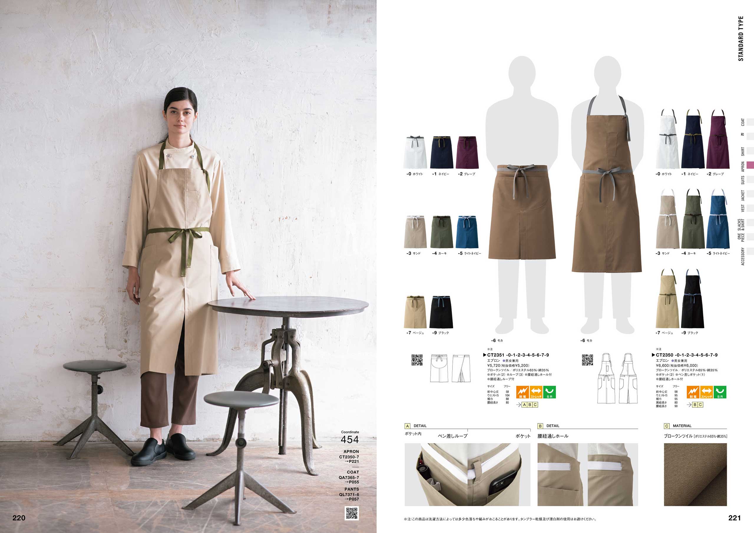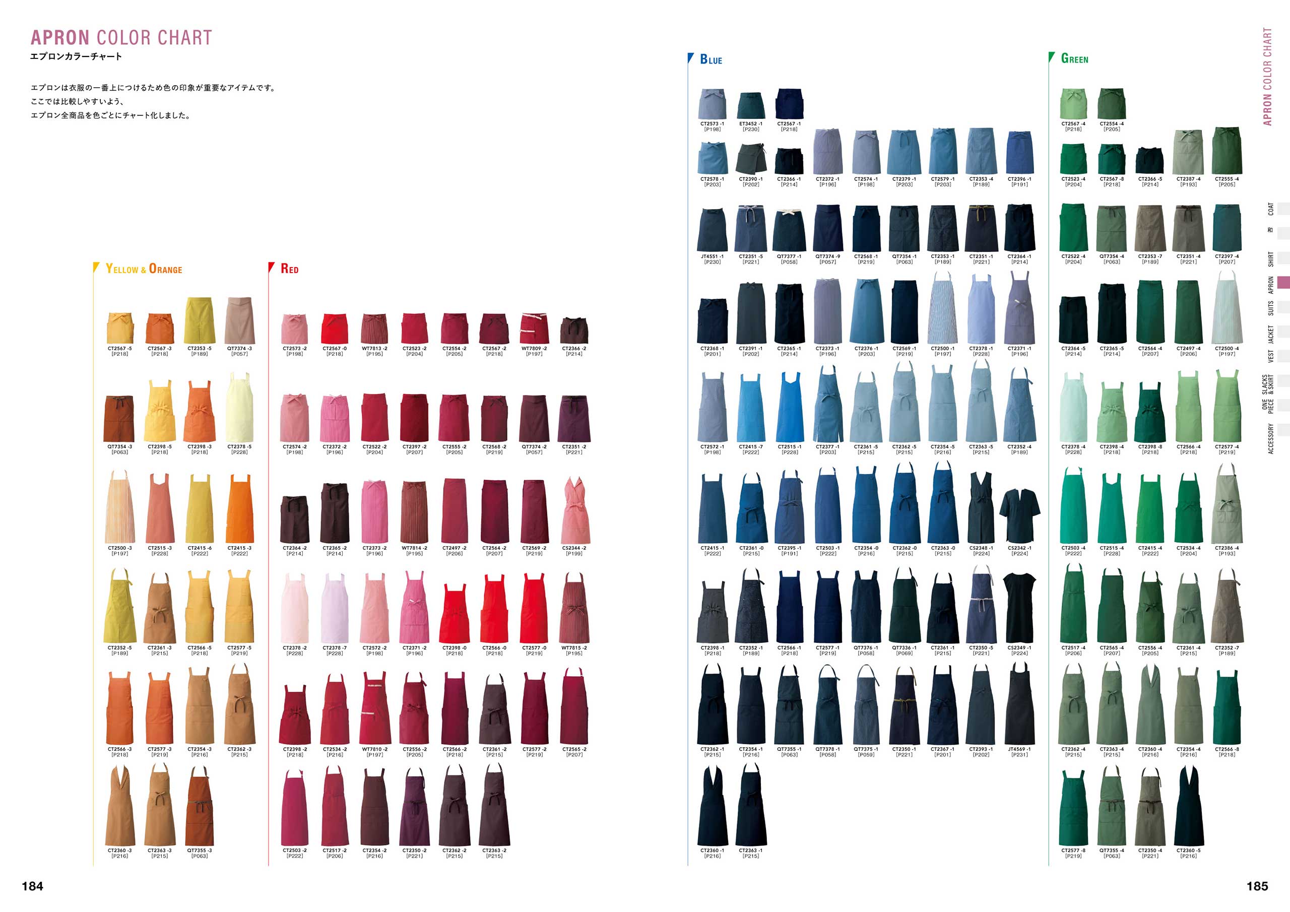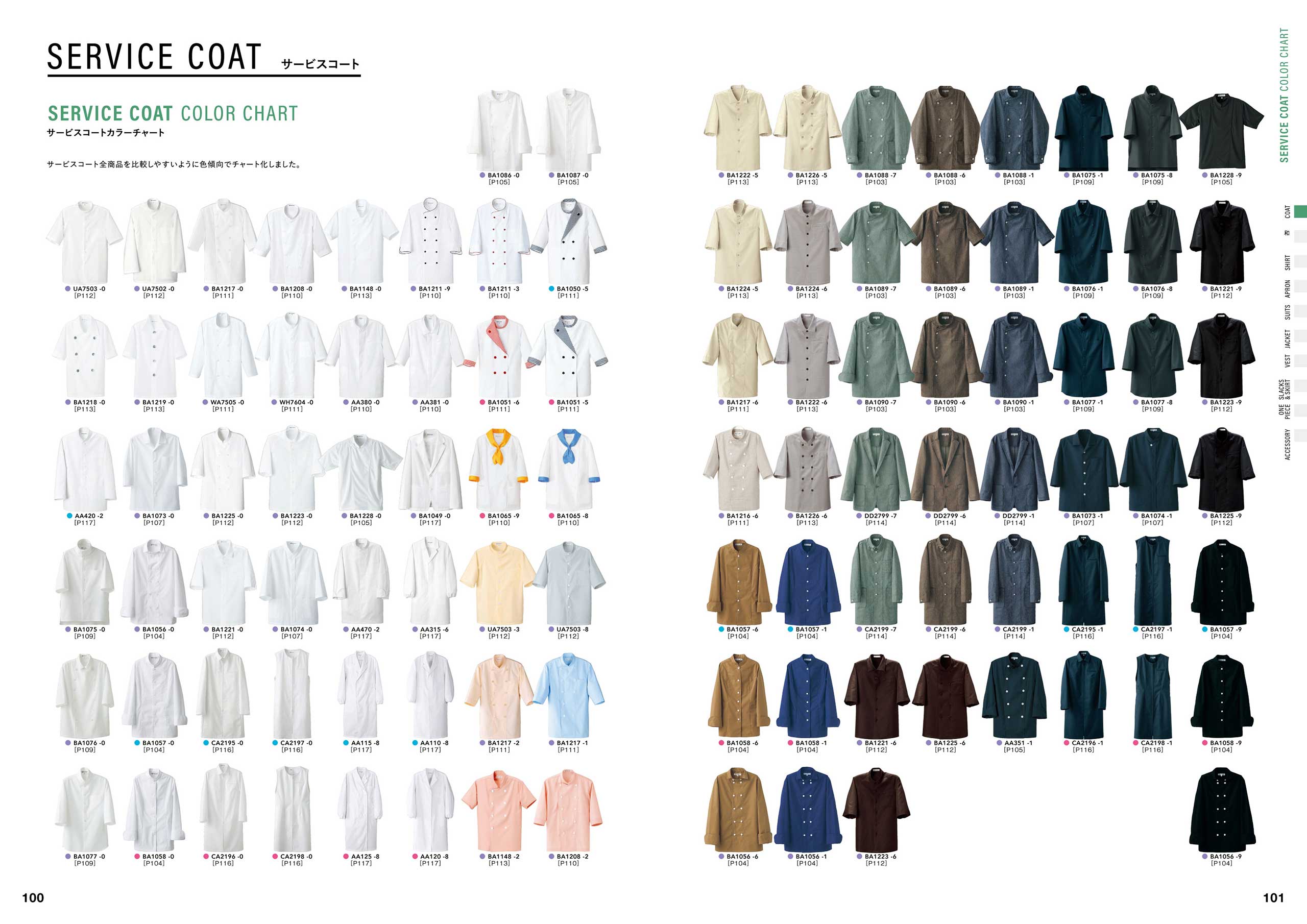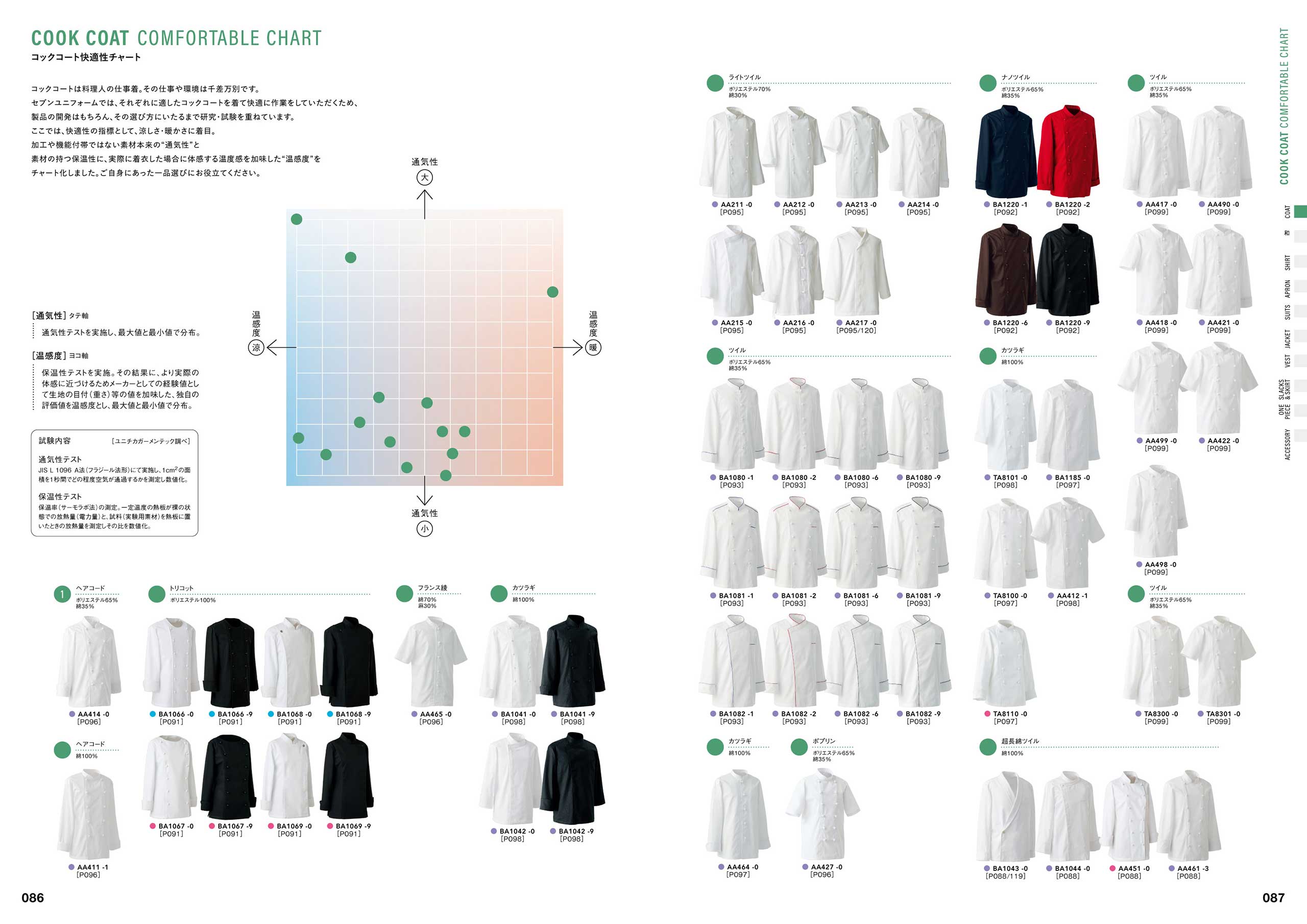 「コックコート快適性チャート」(P086)、「スラックス伸縮性ランキング」(P264)など、商品の機能を多角的に検査し、お客様の目的・用途に合わせて商品を選んでいただける商品比較チャート図。また、商品の色・デザイン一覧から商品を選んでいただけるカラーチャートなど、多くのアイテムから様々なポイントで商品をお選び頂くための企画ページも準備しています。