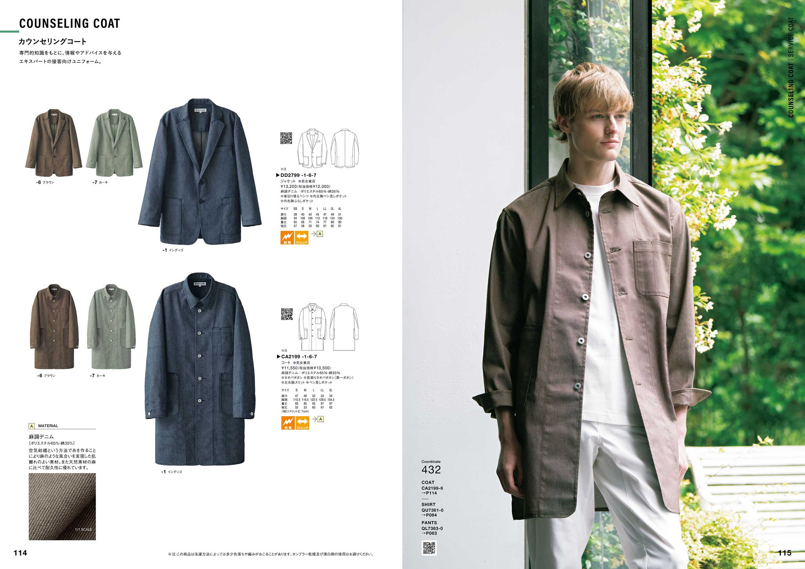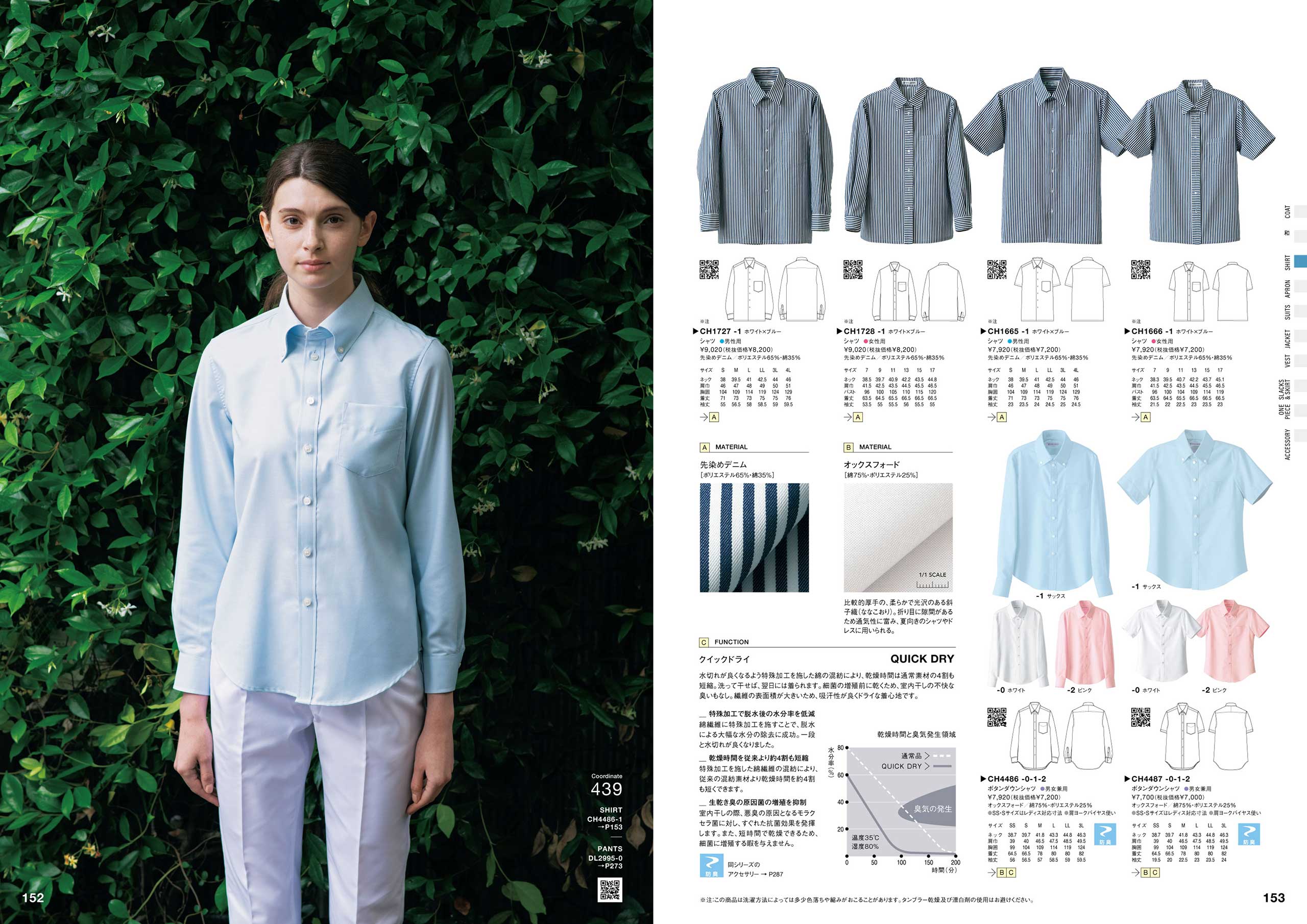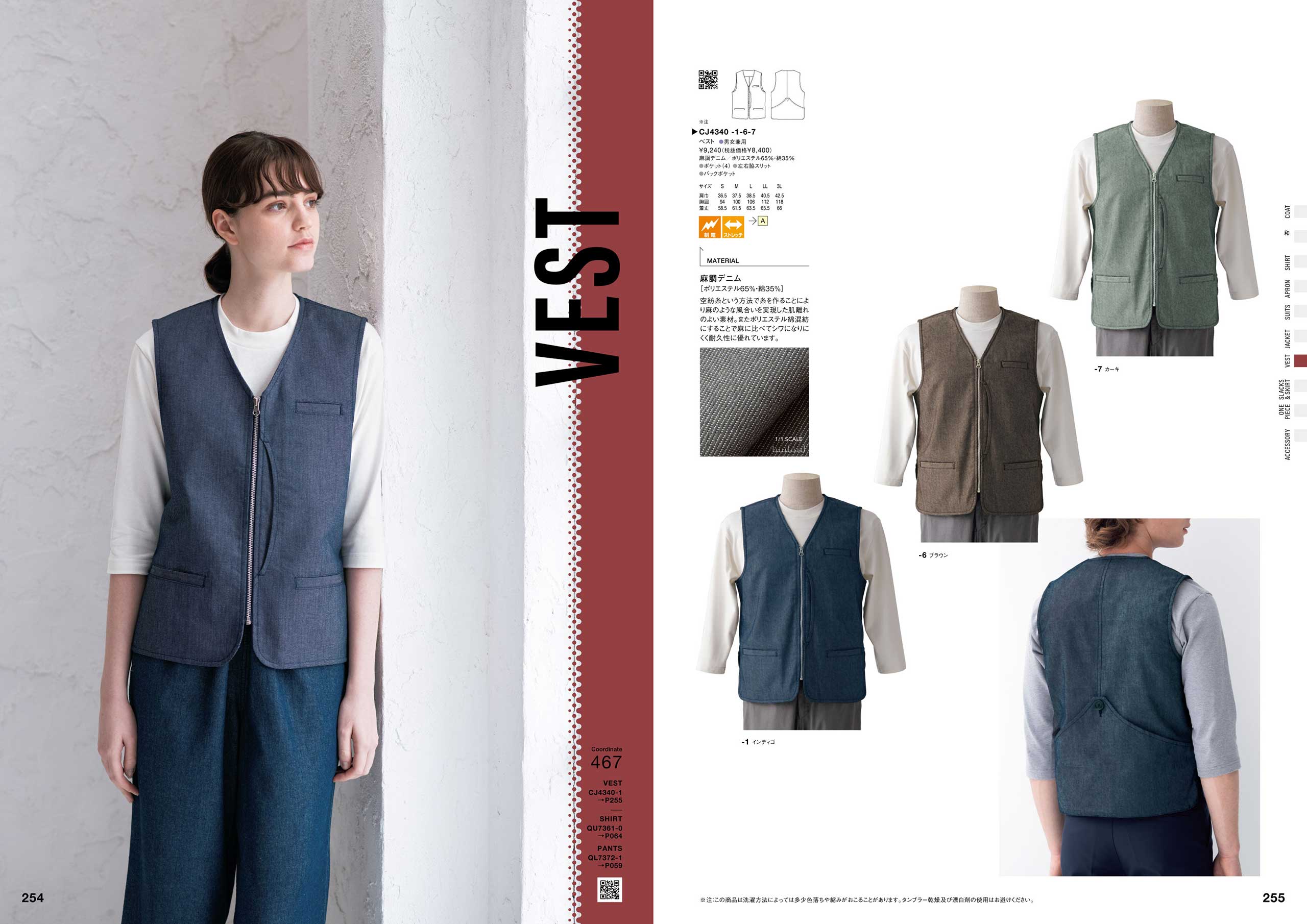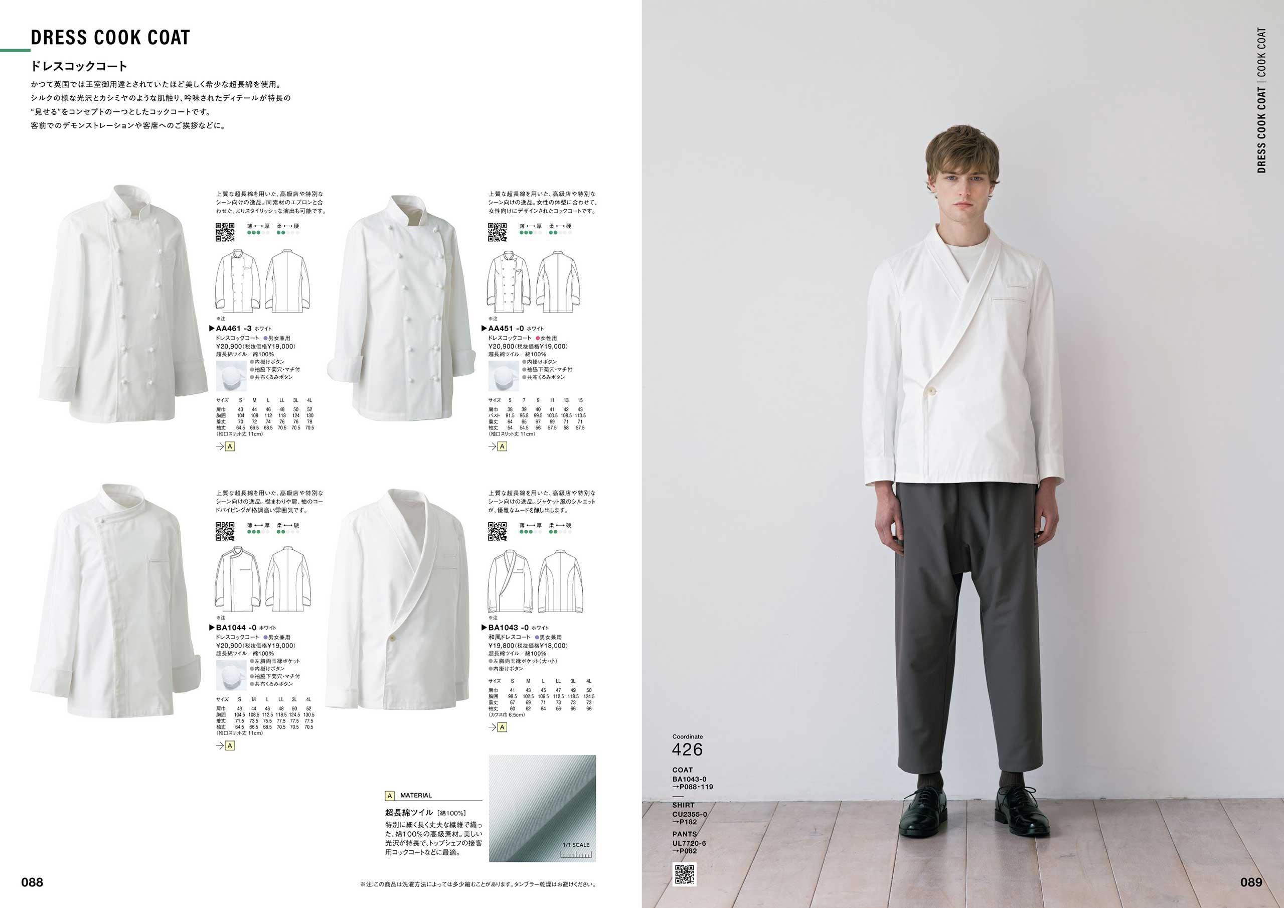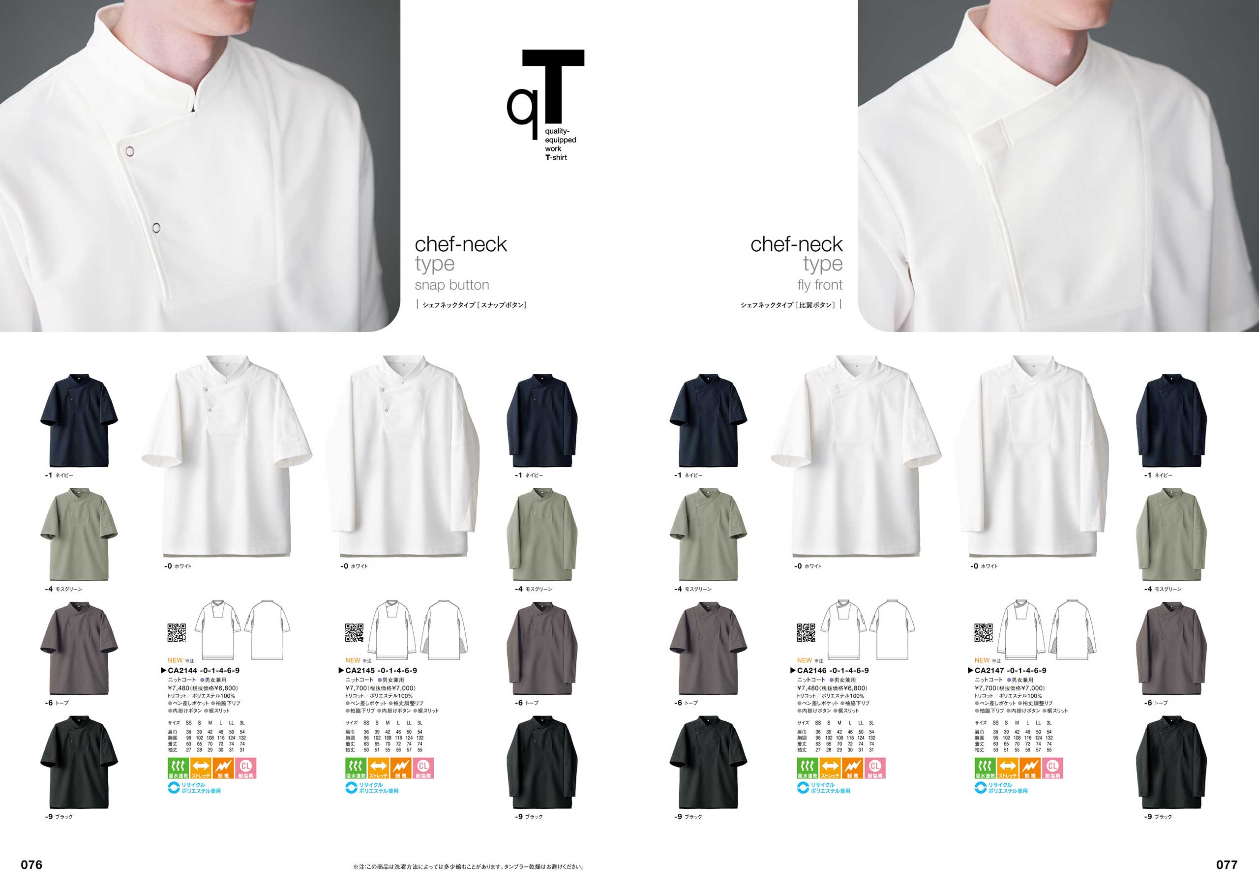 「コックコート快適性チャート」(P086)、「スラックス伸縮性ランキング」(P264)など、商品の機能を多角的に検査し、お客様の目的・用途に合わせて商品を選んでいただける商品比較チャート図。また、商品の色・デザイン一覧から商品を選んでいただけるカラーチャートなど、多くのアイテムから様々なポイントで商品をお選び頂くための企画ページも準備しています。