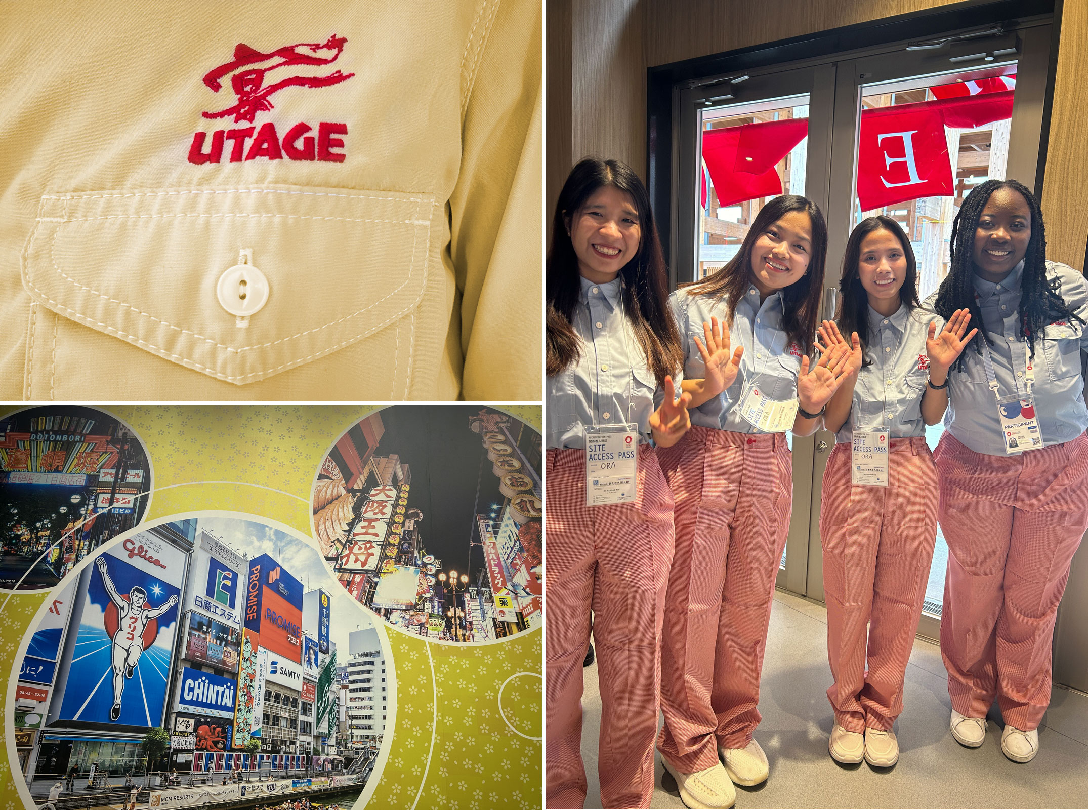 「ご提案いただいたデザインを初めて見た時は少し派手な印象を受け、自分が着るのには恥ずかしいかな‥と感じました。しかし、デザイナーさんから『大阪人が恥ずかしがってどうします?派手でなんぼや!ですよ。反対にお客様にすぐ見つけてもらえないと失礼にあたりますわ!』と叱咤激励されました。改めて他案と比べると、確かにひときわ目を引くデザインです。内装に負けない視認性と機能性を兼ね備えており、きっとORA外食パビリオンの象徴的な存在となるでしょう。」(事務局スタッフ)