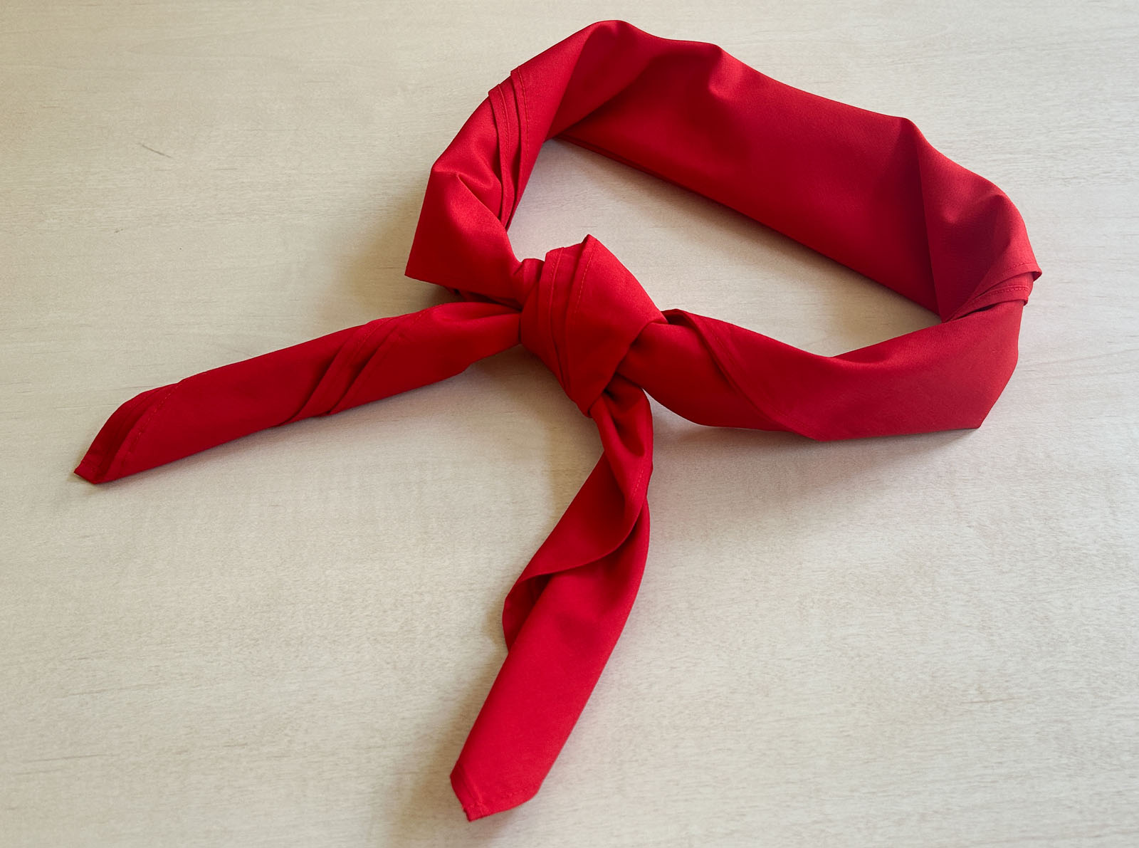 赤スカーフはアテンダーのシンボルのひとつですが、その着用方法は各スタッフに任されます。