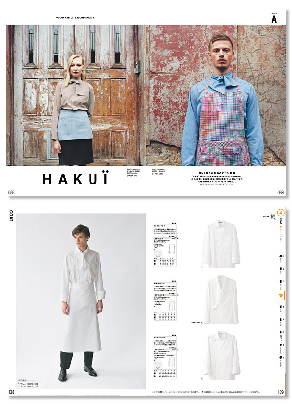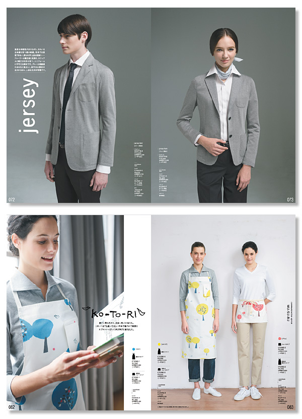 今号には、先端技術や最新トレンドを取り入れた新商品のほか、近年増加している新業態の店舗に向けた新感覚のアイテムも多数登場。伸縮素材をスタイリッシュに用いた「jersey(ジャージー)」や、人気イラストレーター・谷山彩子さんデザインの「コミュニケーションエプロン MU-SU-BU(むすぶ)」などの新シリーズは、特集を設けてくわしく説明しています。