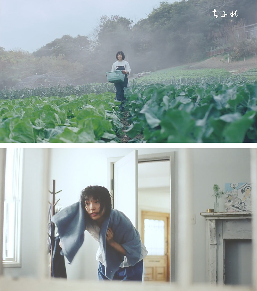 自家栽培したこだわりの野菜を提供するビストロの調理場で、女性スタッフ役の女優・芋生 悠(いもう はるか)さんが、調理服として「HAKUÏ」のユニフォームを着用しています。