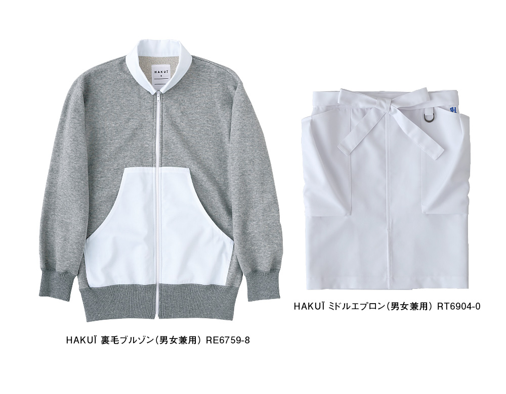 CMに登場している、「HAKUÏ 裏毛ブルゾン(RE6759-8)」は、身頃と袖には肌触りがよく着心地も良い綿100%の素材を使用し、特徴的な白衿と大きな白ポケットには、抗菌、防臭、撥水、撥油性のある布帛を使用しています。着用すると少しオフショルダーになるオーバーサイズのシルエットで、ザックリとした着こなしが可能です。白いポケットに白い腰下エプロンを合わせるコーディネートが◎。小さな胸当てエプロンのように見えるデザインも楽しめます。