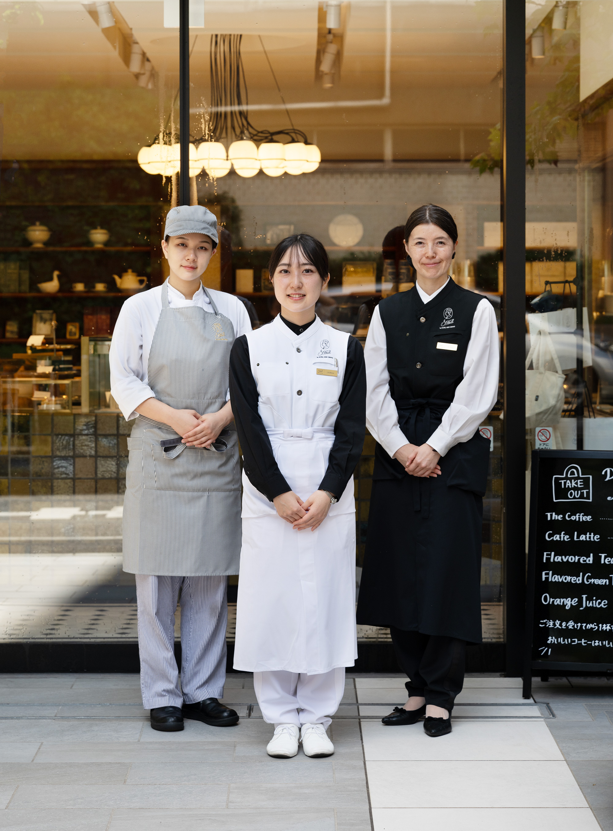 あとは何と言ってもロゴの刺繍が可愛くって!ここまで繊細に横顔の表情を表現できるとは思わなかったので驚きました。繊細なロゴが胸元にあるだけでユニフォームがすごく映えますね。日によって色の異なるユニフォームを着ていると、お客様からの反応も良いです。テイクアウトのコーヒーをお渡しする際に、今日は白色なのね、などお声掛けいただくと仕事にもやりがいを感じます。」(販売スタッフ)