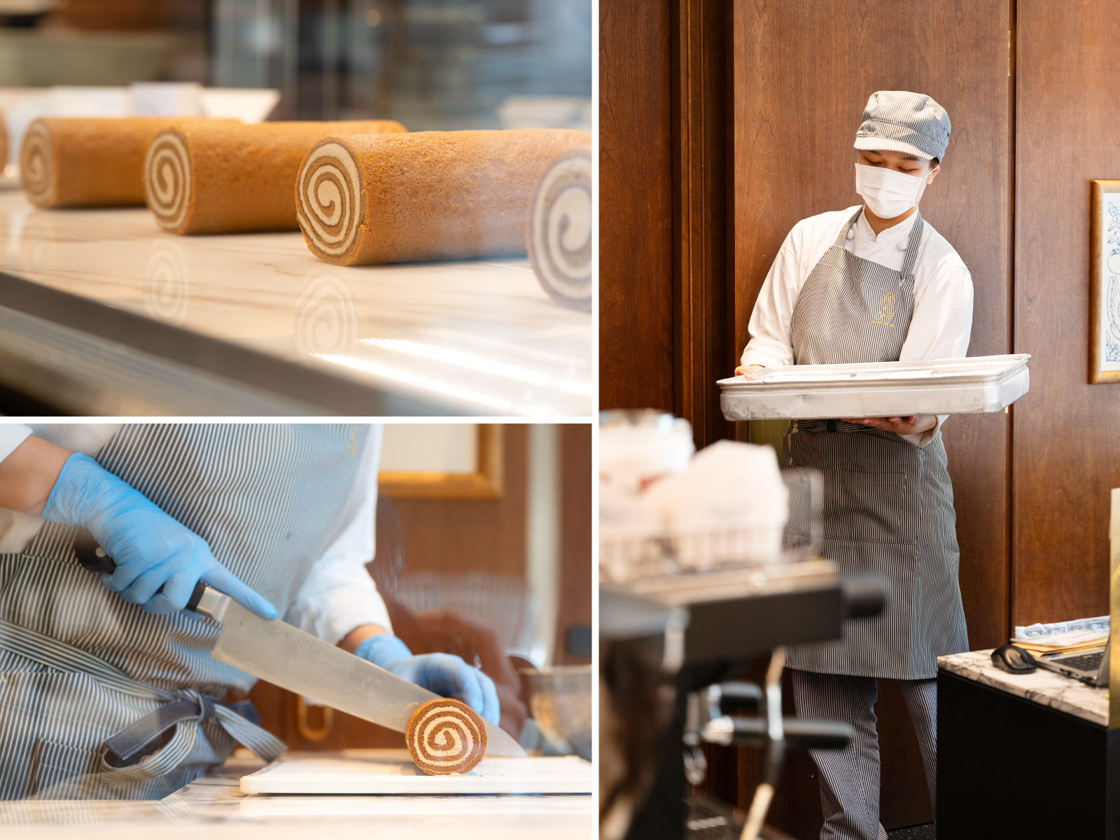 タイミングが合えば働くパティシエの姿をガラス越しに見られるのもこの店舗の特徴です。「モカルーロ」の「巻き」「カット」「梱包」を見ることが出来ますが、何が見られるかは当日のお楽しみとの事。取材時は「カット」「梱包」の作業日だったため、目の前には次々と正確に切り出された「モカルーロ」が並んでいきました。カット端を「ミミルーロ」として販売をするアイディアを出したのもスタッフだったとか。