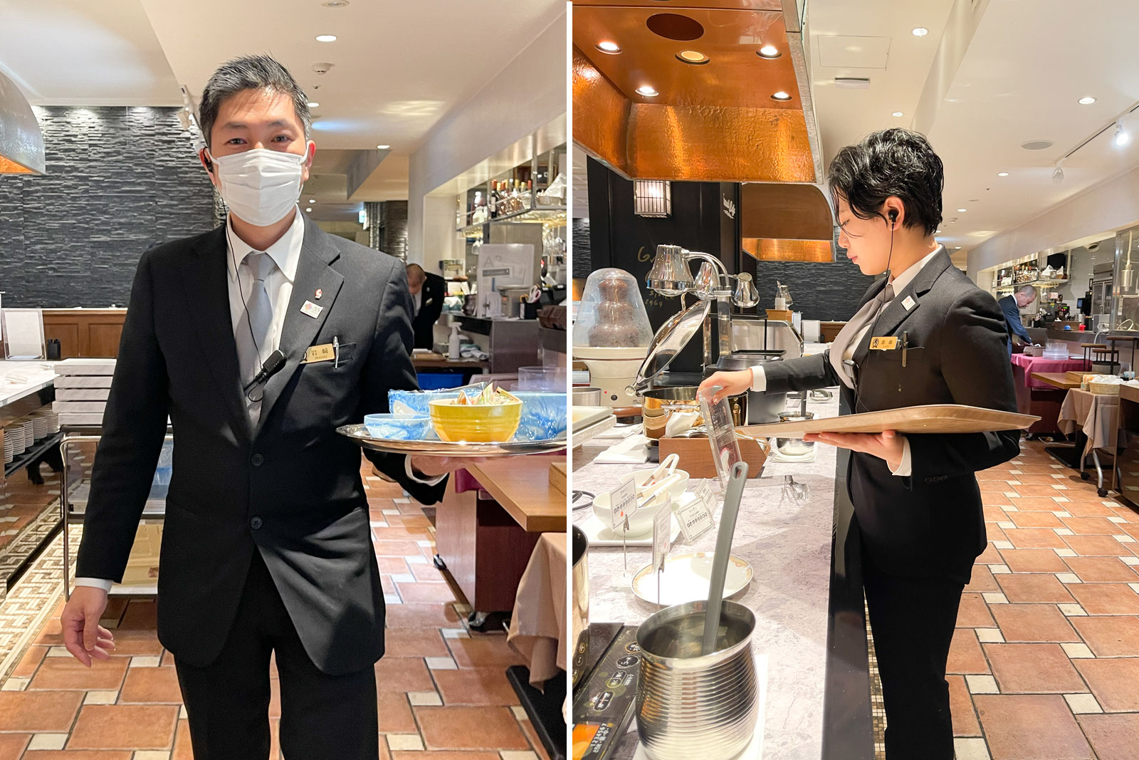 これまで宴会サービスではシティホテルとしての品格を保つためタキシードを着用していましたが、今回はお客様へより迅速な対応ができるように動きやすいテーラードスーツを採用。人数が多い配膳サービスではアイテム数を集約しても見栄えのするコーディネートにし、パンツは塩素系漂白剤を薄めずに原液がかかっても色落ちしない「EVER BLACKシリーズ」を採用しました。