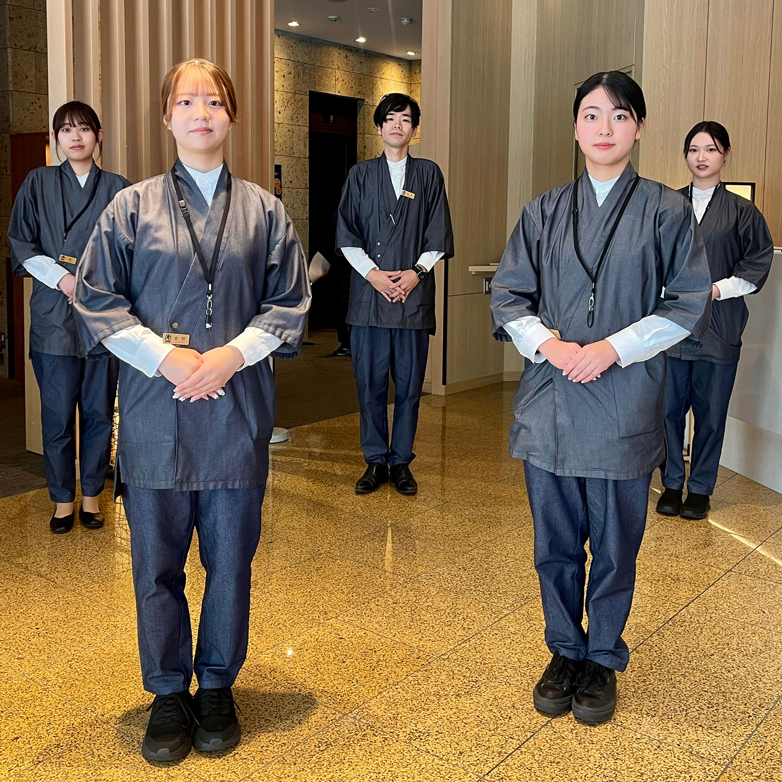 「旅館ではこのような作務衣スタイルを見かけますが、ホテルでは珍しいようでお客様とも会話が弾みます。特にデニム素材の作務衣は斬新で、この採用は一つのチャレンジでしたね。パンツは共通ユニフォームですので、ホテルグループとしても統一感が出せたと思います。」(西鉄ホテルズ 宿泊運営部主任/木下様)