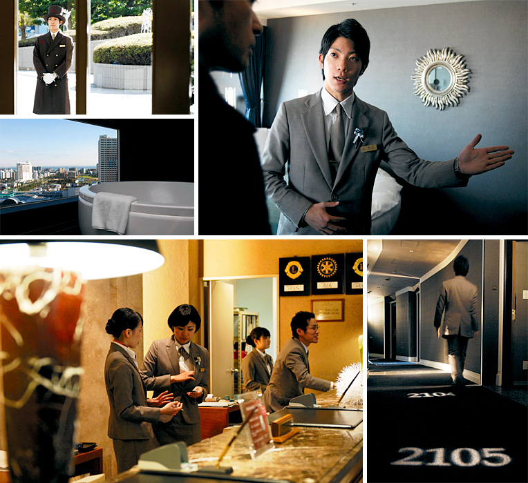 担当ごと別々だった制服も、一種類に統一。ドアマンもコートと帽子を取れば、他の人と同じスーツです。「大仰なデザインの多いホテルユニフォームの中で、シンプルで質の良い制服になったと思います。お客様も担当を気にすることなく、気軽に声を掛けて下さいますよ」(氏家さん)