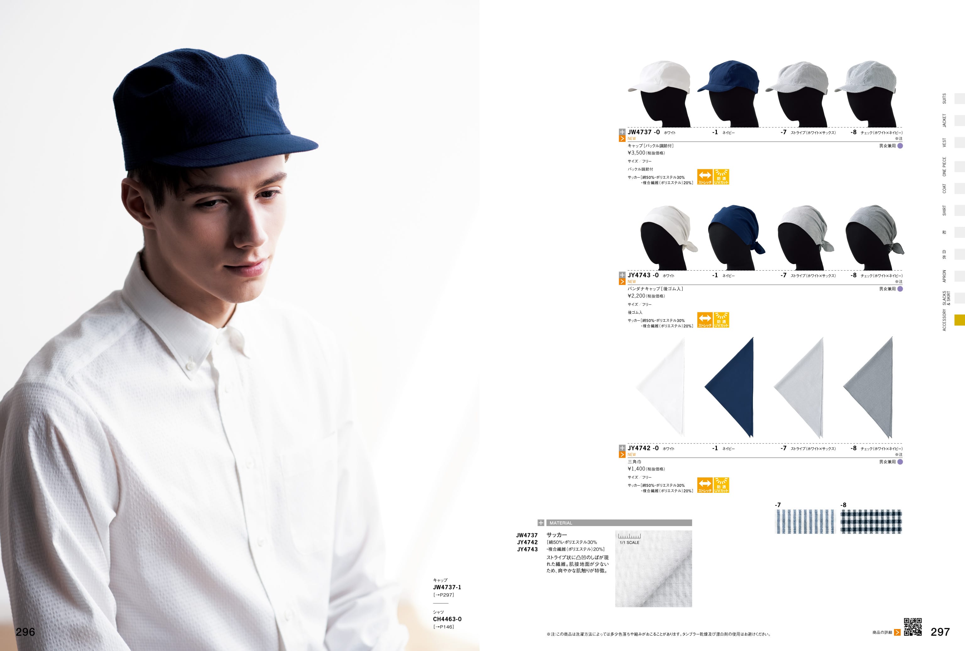 小物はキャップ(JW4737)、バンダナキャップ(JY4743)、三角巾(JY4742)をご用意しました。色は全て4色展開。“しぼ”の表情を楽しんでもらいたい無地のホワイト(-0)とネイビー(-1)、生地と相まってより爽やかなホワイト×サックスのストライプ(-7)、ホワイト×ネイビーのチェック(-8)です。カジュアルに、和装にと、様々なシーンでお使い頂けます。