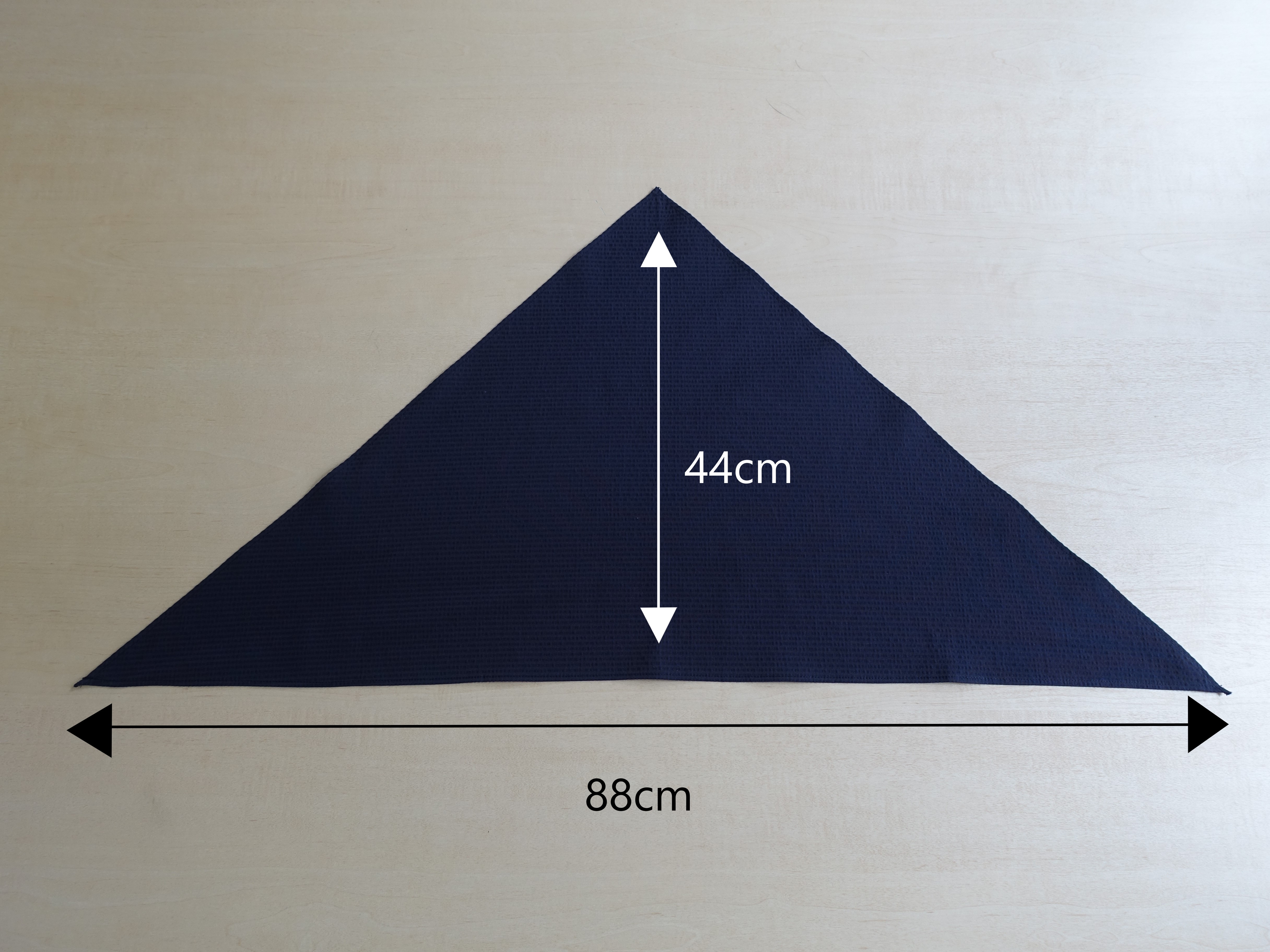 サイズフリーの三角巾は、横巾88㎝、中心丈44㎝です。オーソドックスに頭に巻いてもいいですし、折りたたんでハンカチーフの代わりに胸ポケットへ差せばコーディネートに表情がでます。また2色の三角巾を1枚ずつ使用したヘアバンド風のアレンジもおすすめです。こちらの記事でご紹介していますのでぜひご参考ください。