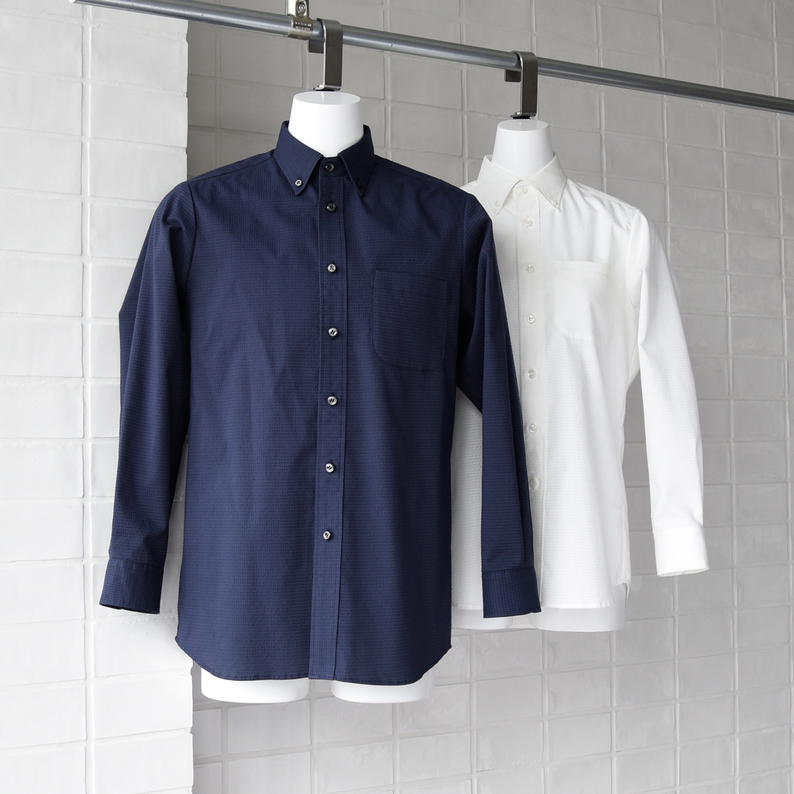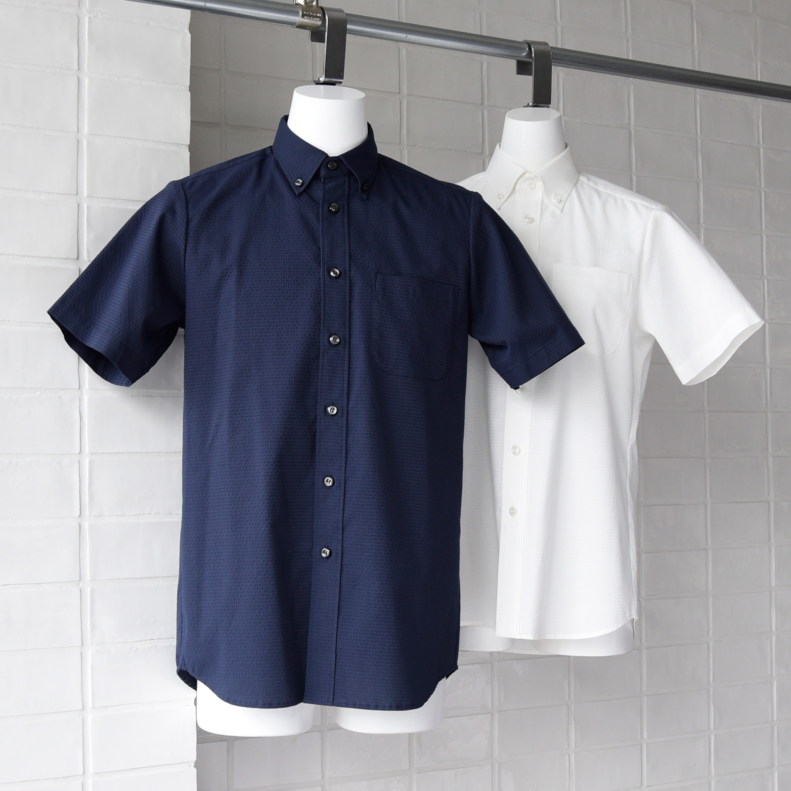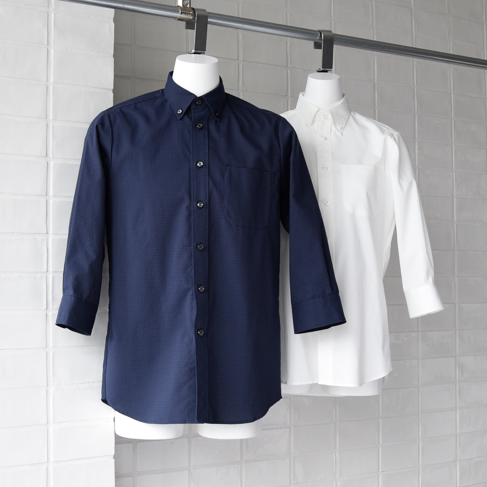 色は近年定番色として人気を博しているネイビー(-1)とホワイト(-0)です。ホワイトは爽やかな印象を与え、カジュアルなホテルでスーツのインナーとして活躍が期待できます。またネイビーは濃紺とシアサッカーの生地感が相まってリラックスした和の空気感を表せます。