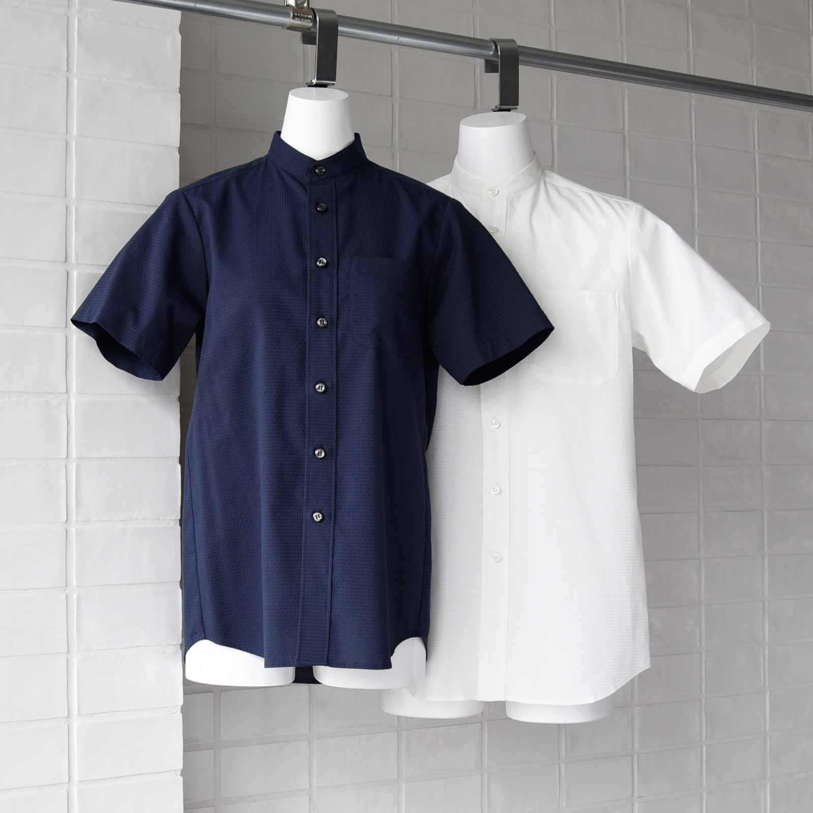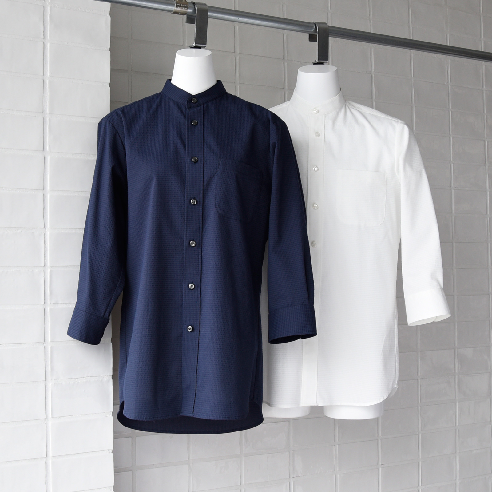 セブンユニフォームのシャツにはシンプルなものから個性的なものまで様々なタイプがあります。このシアサッカーシリーズのシャツは形こそシンプルですが、生地感に表情があり爽やかな、且つどこか和も感じられる。そんなシャツに仕上がりました。