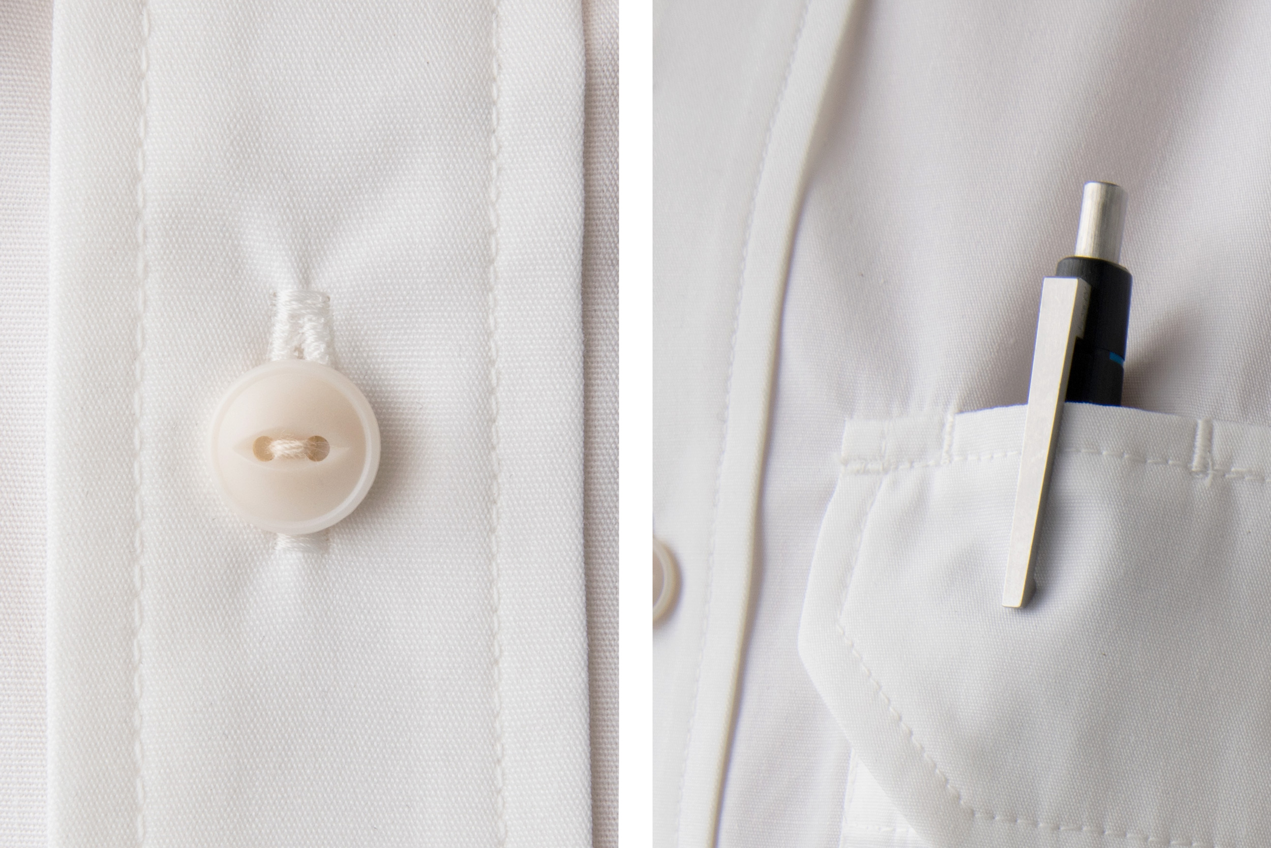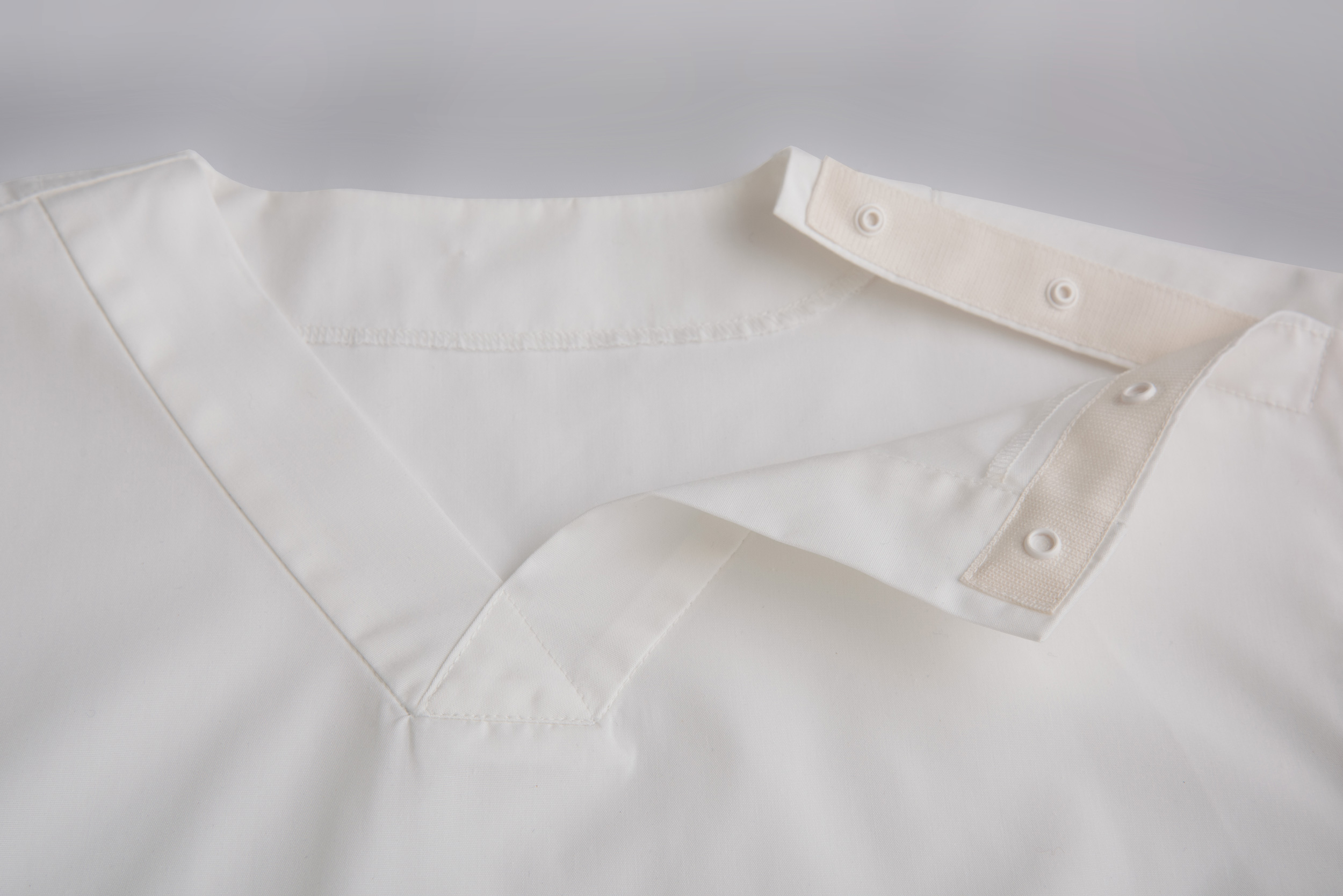 袖口は二重構造になっています。アンダーカバー(内側の布)の袖口はリブ仕様にすることで腕にフィットし、体毛の落下などによる異物混入を防ぐことができます。また、袖丈は作業の邪魔にならないよう、少し短い8分袖になっています。