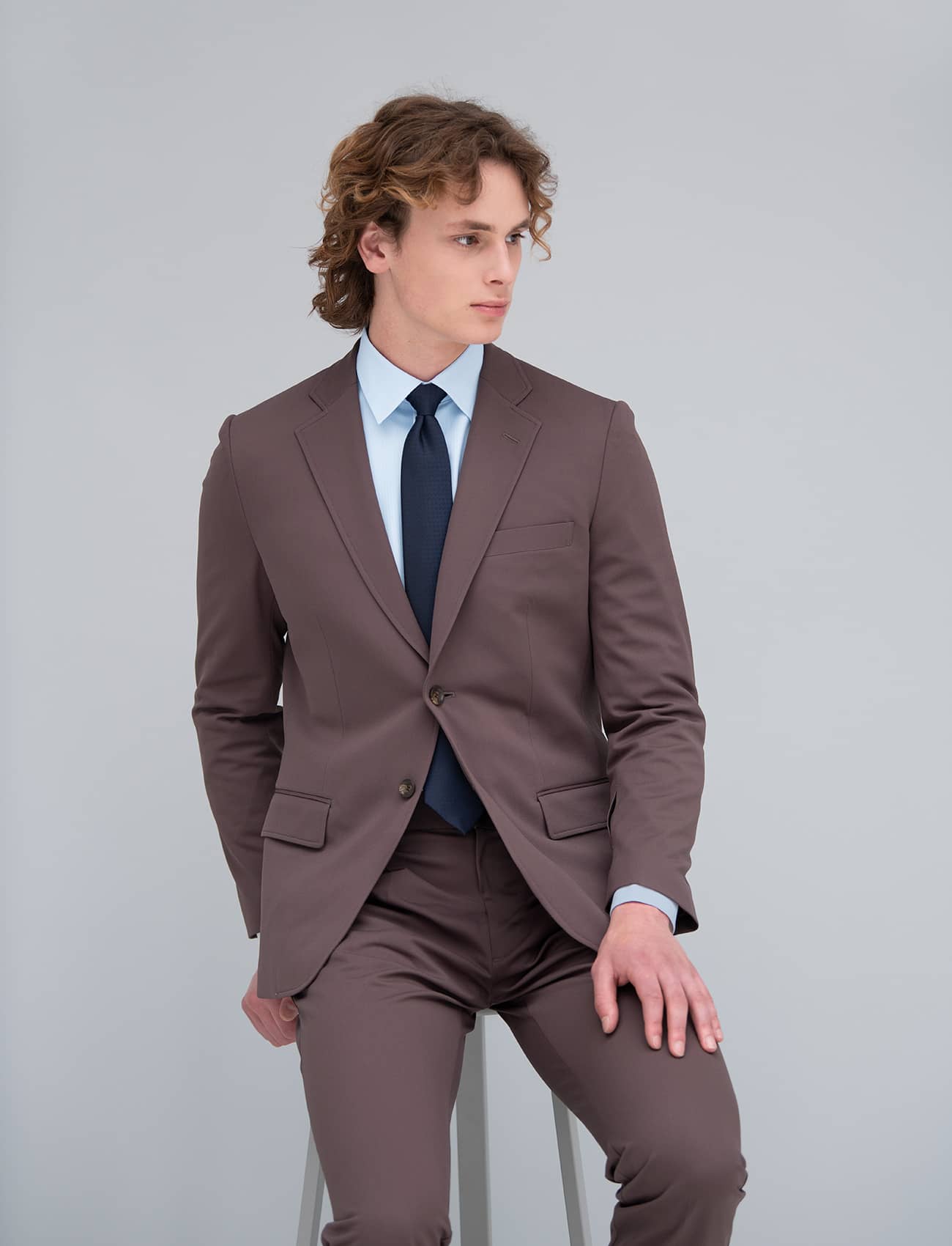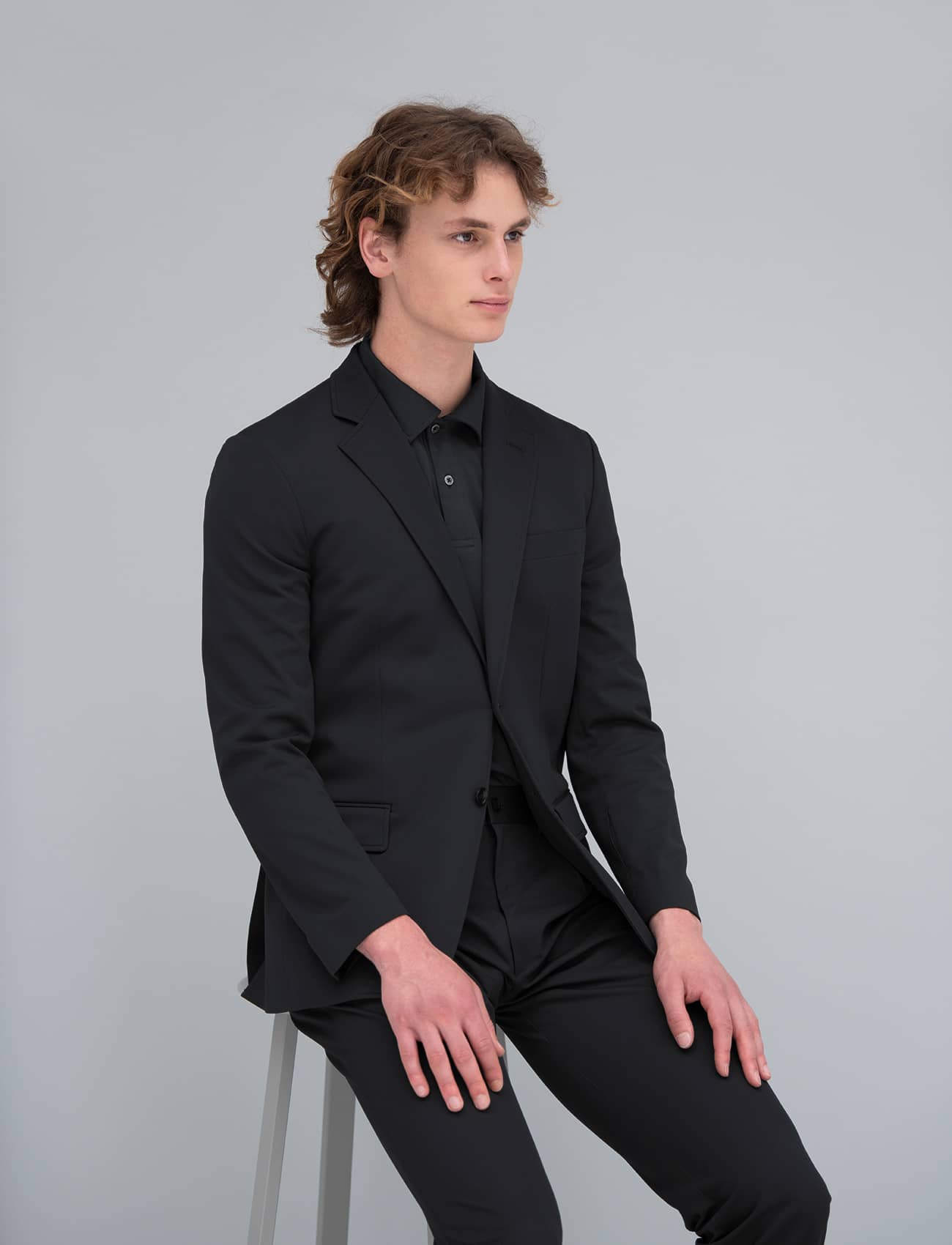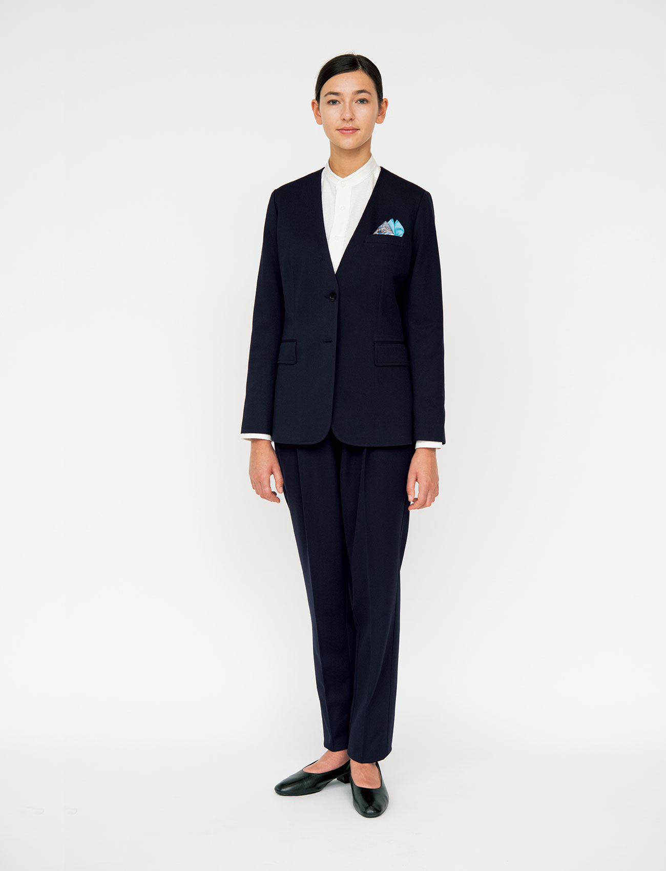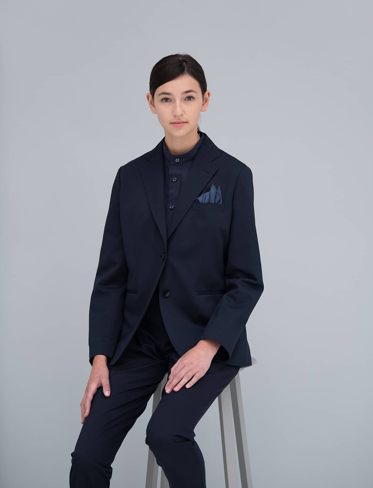 布帛(ふはく)の見え方とニットのストレッチ性を併せ持った、トリコットという経編組織のオリジナル素材を使用したナチュラルフィットスーツシリーズ。