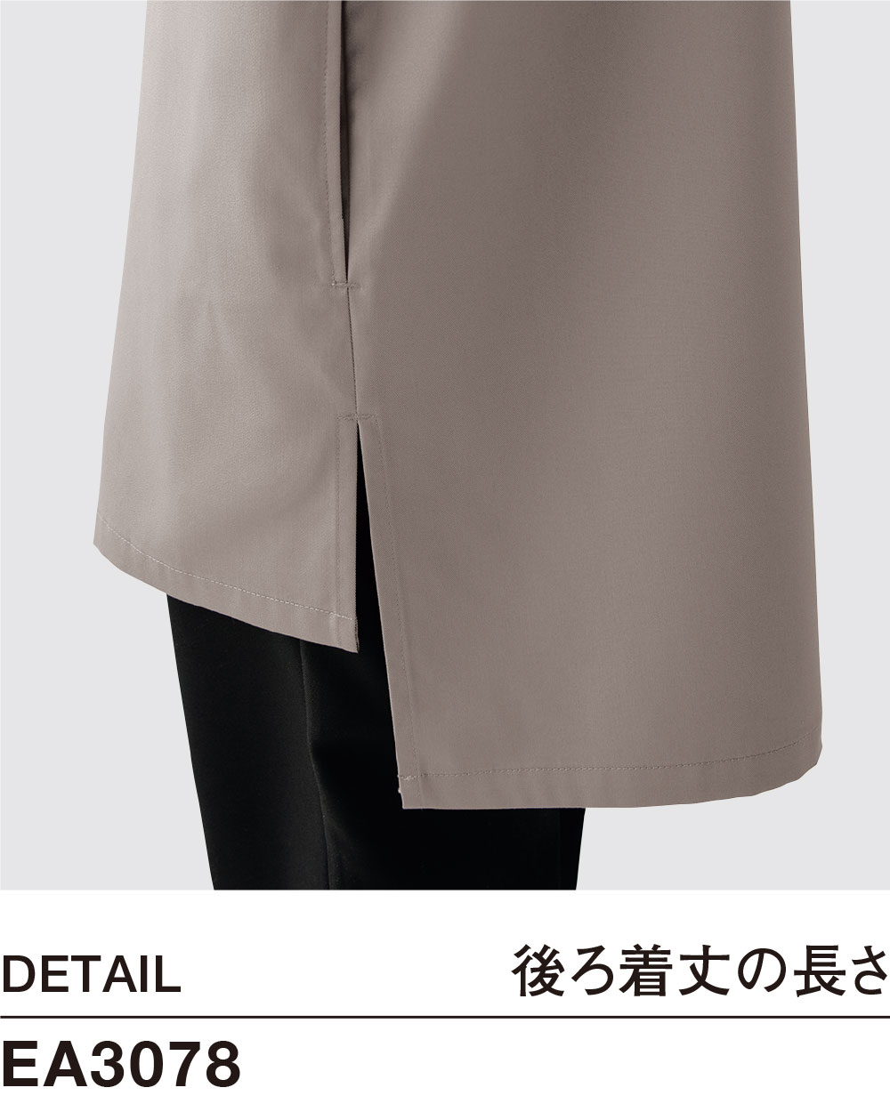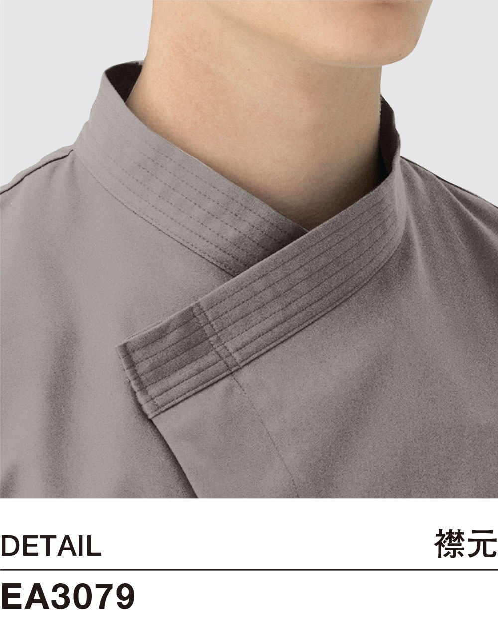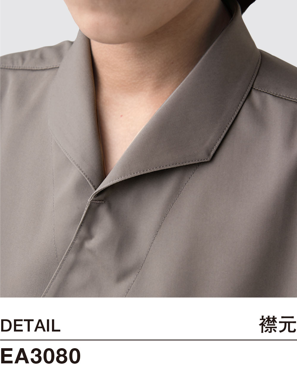 この上衣シリーズは「和の雰囲気を感じさせる衿」が特徴です。また、作務衣や和コートで胸元が見えてしまう問題を解決すべく、何度も試作を重ねて、安心して1枚でも着用できる衿あきを追求いたしました。上衣(EA3076、EA3077、EA3080)は、ボタンの見えない比翼仕立て、胸ポケットのない仕様で、胸元にロゴ刺繍を入れる際にはサイズを気にせず目立たせることができます。