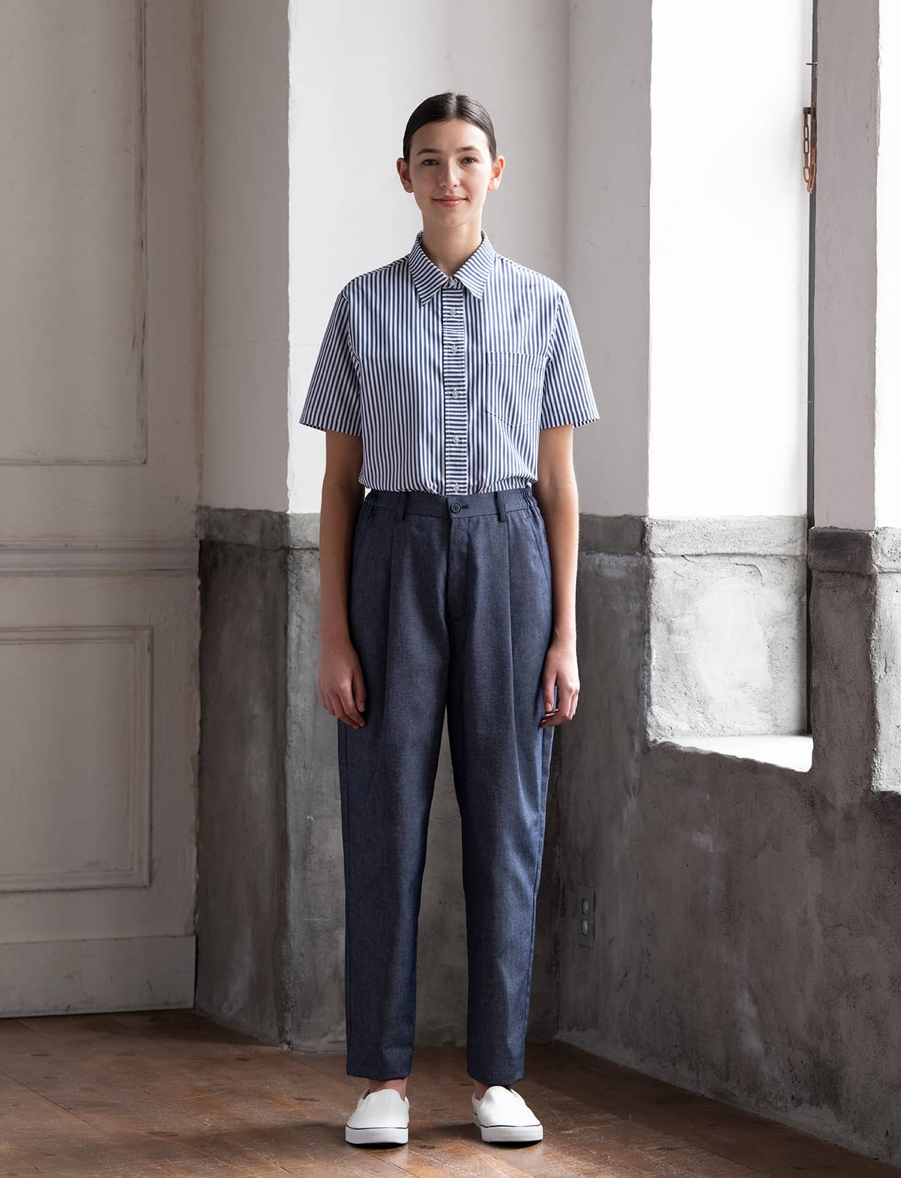 カジュアルな印象が強くなりがちなデニムのアイテムですが、シルエットやポケットの形をサービス向けに新たに構築し、エレガントな雰囲気に昇華しています。ストレッチ性や制電といったユニフォーム特有の機能は勿論のこと、ステッチやボタンなどのデニムらしい要素が随所に見られながら、ホテルなどラグジュアリーなシーンで着用しても違和感のない印象に仕上げられた、新しいデニムユニフォームです。