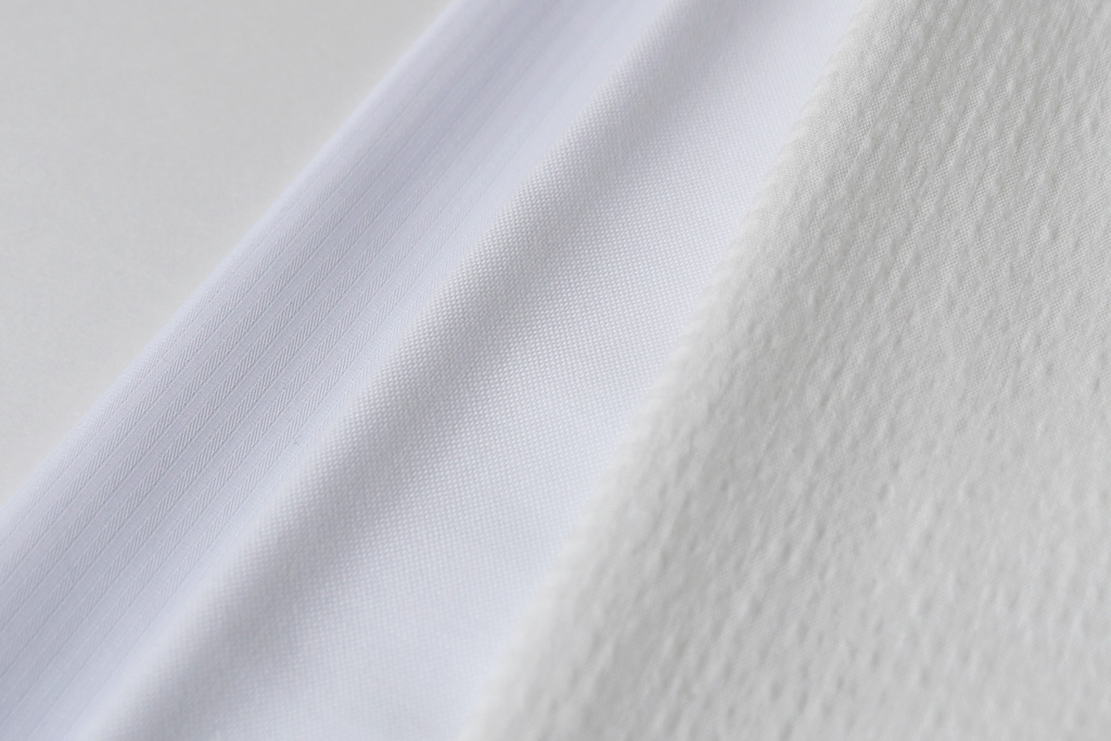 一番苦戦した点は「“工業洗濯”に耐えられる品質」を実現することでした。シアサッカーは生地を織る際に糸の張り具合に強弱をつけており、この糸の収縮度の違いによって“しぼ”が生じています。そのため家庭洗濯よりも高温で洗濯・乾燥する工業洗濯をすると生地が大きく縮んでしまったのです。繰り返し着用し洗濯するユニフォームにおいて縮みは御法度です。1年以上の研究・試作を経て、ようやく工業洗濯にも耐えられる、厳しいユニフォームの基準をクリアしました。