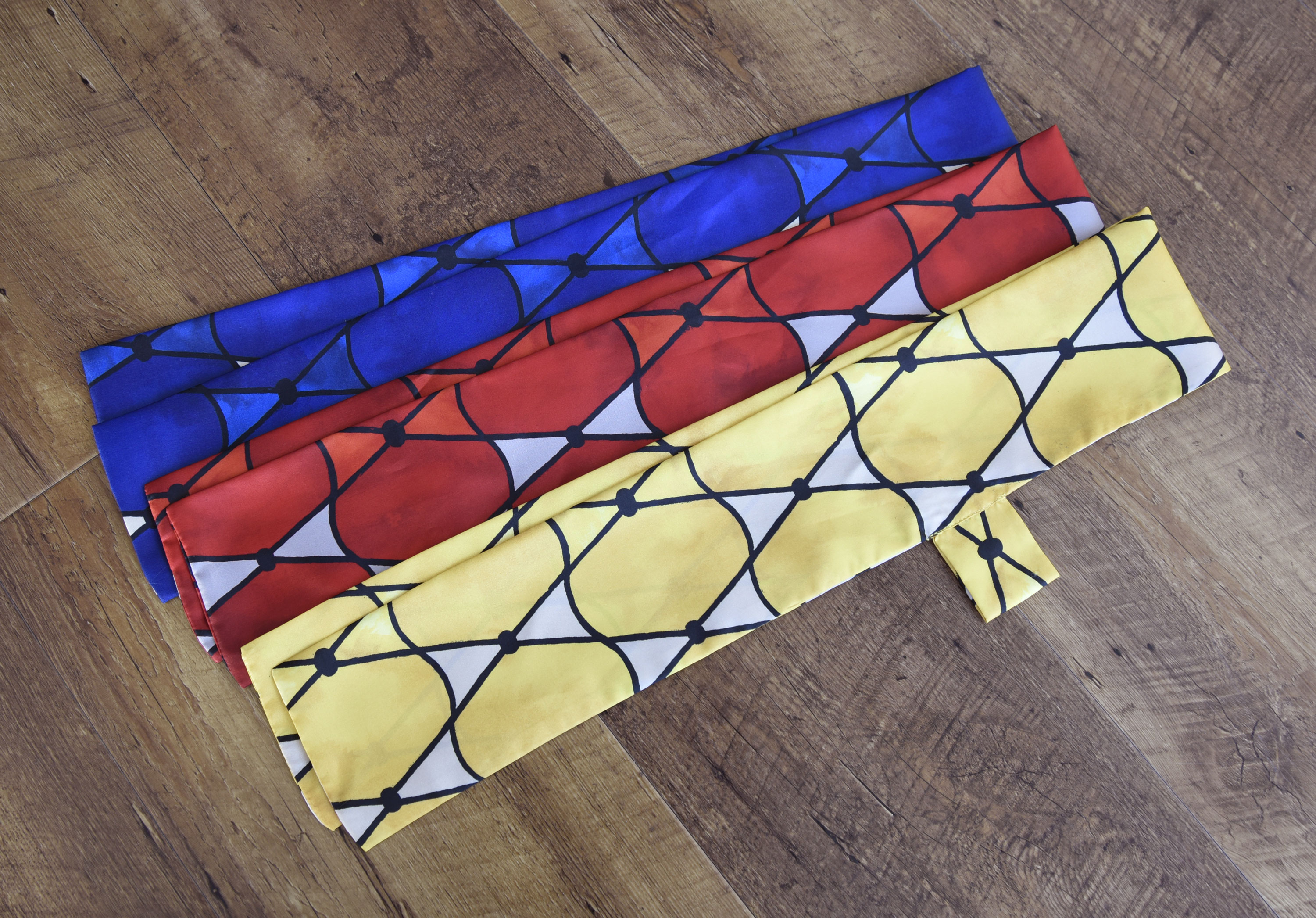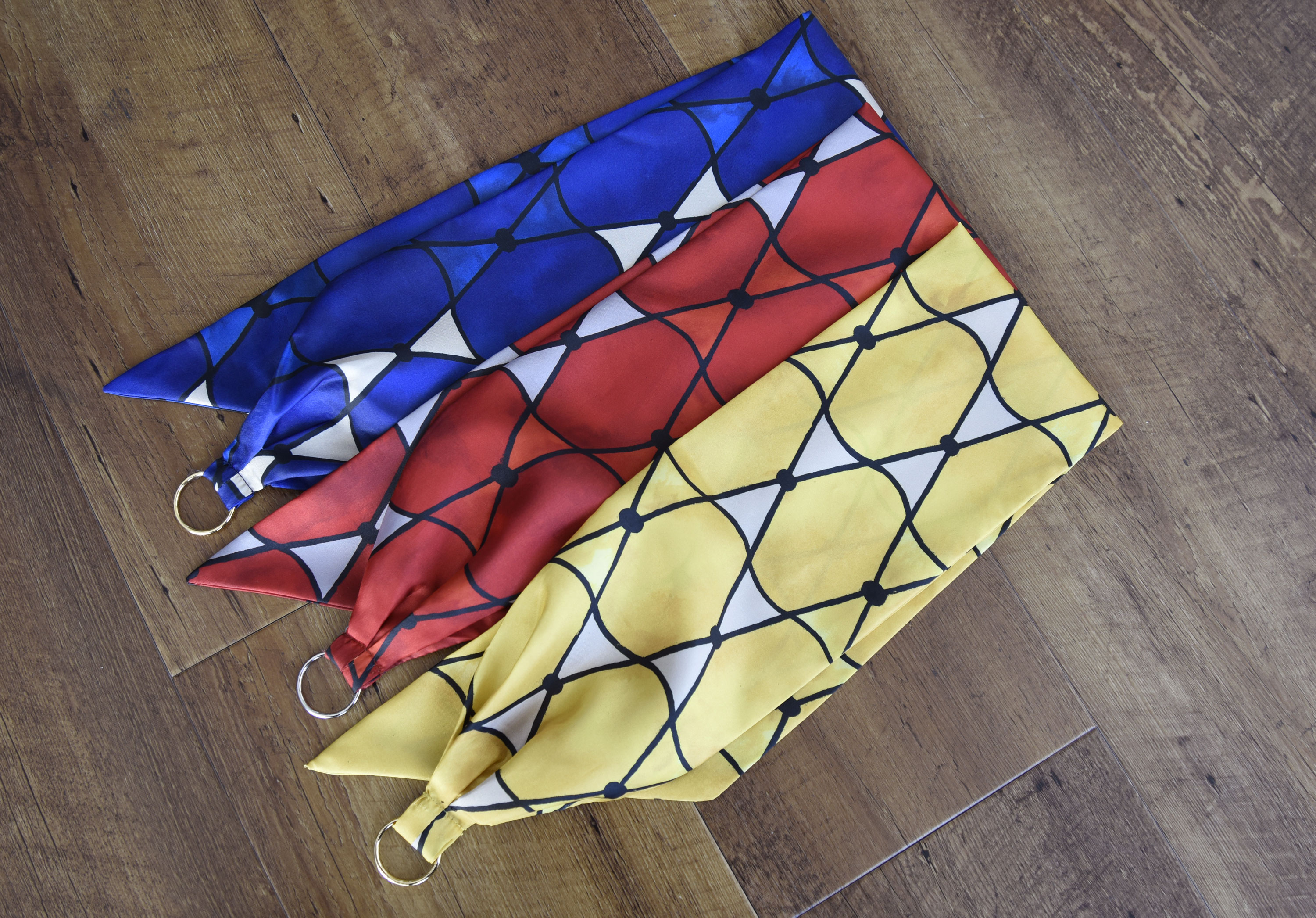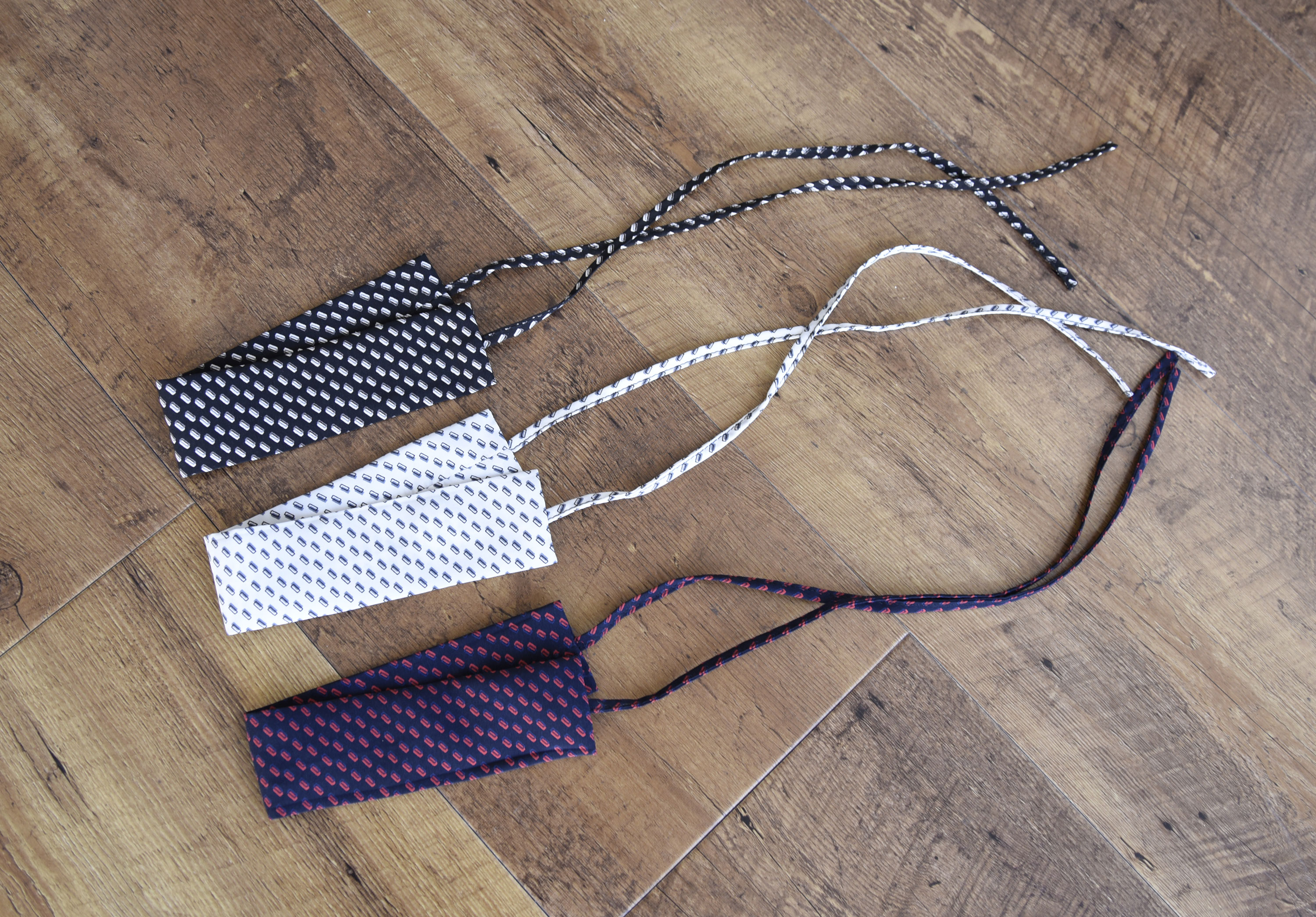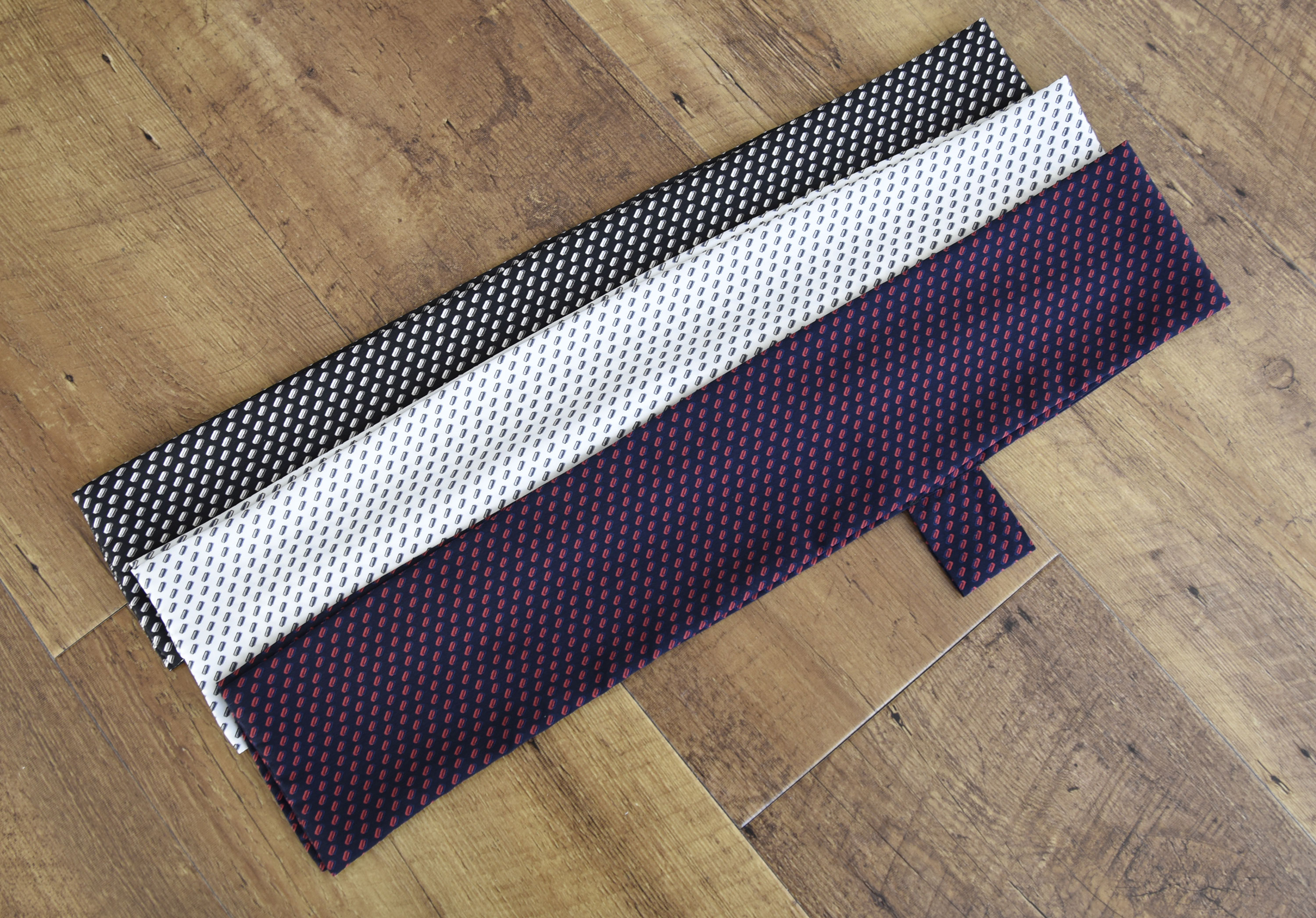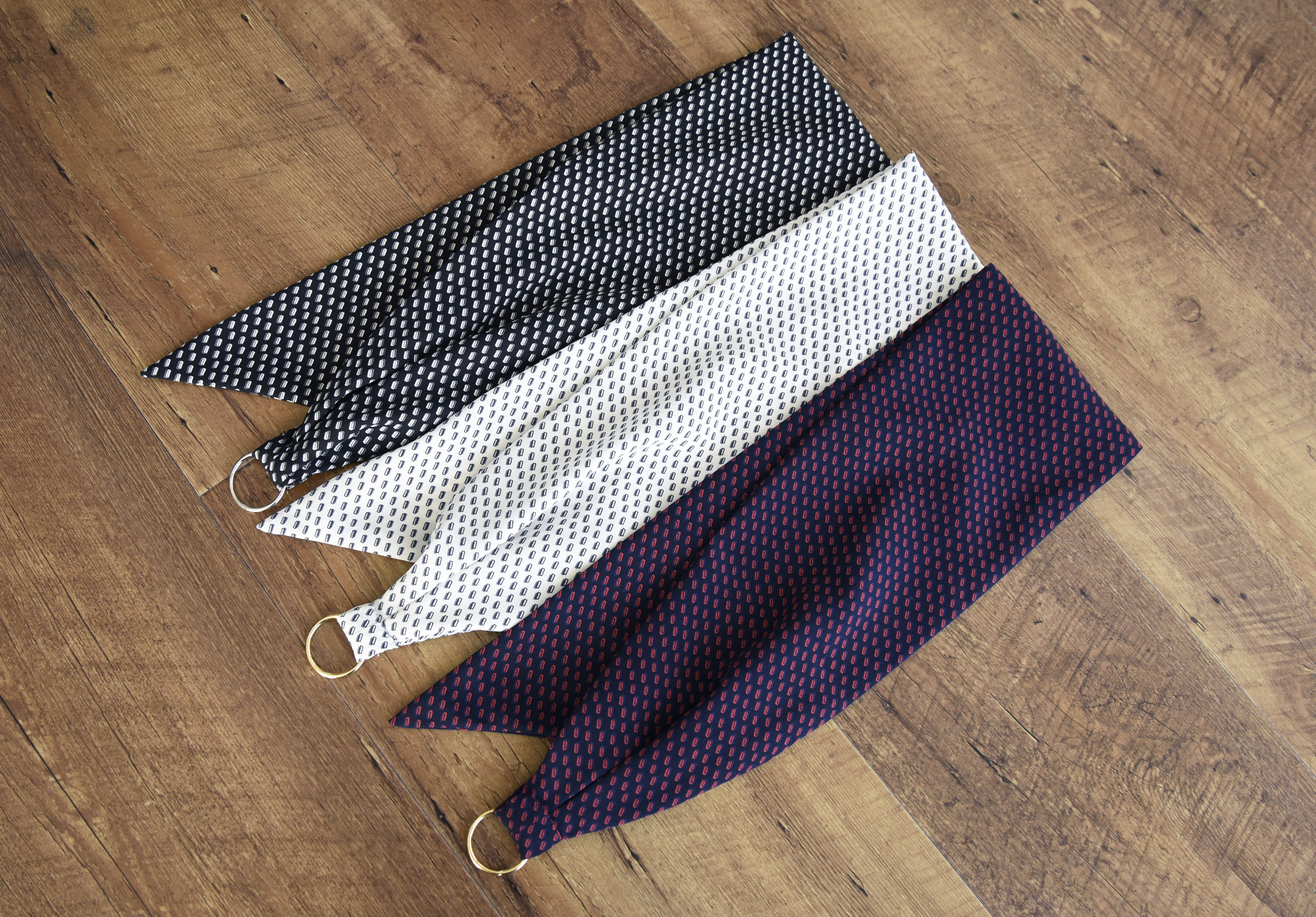 この2柄で、リング付きスカーフ、ループ付きタイ、チョーカーの3型をご用意。