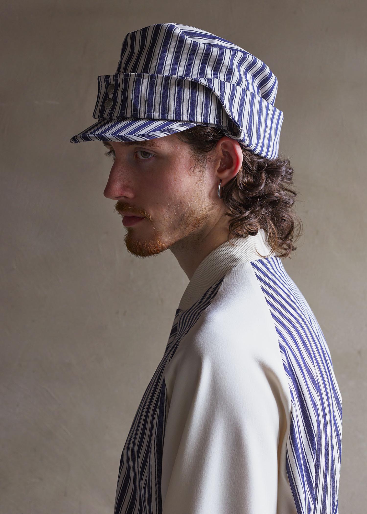 今回の新作「HAKUÏ 32」の中心となるアイテム群の最大の特徴は、前面とバックスタイルが大きく異なる印象のデザインになっていることです。エプロンや胸当てエプロン、ベスト、ブルゾン、パンツ類などはすべて、前身頃にストライプの素材を用いている一方、背中側は全面に無地の生地を使用。