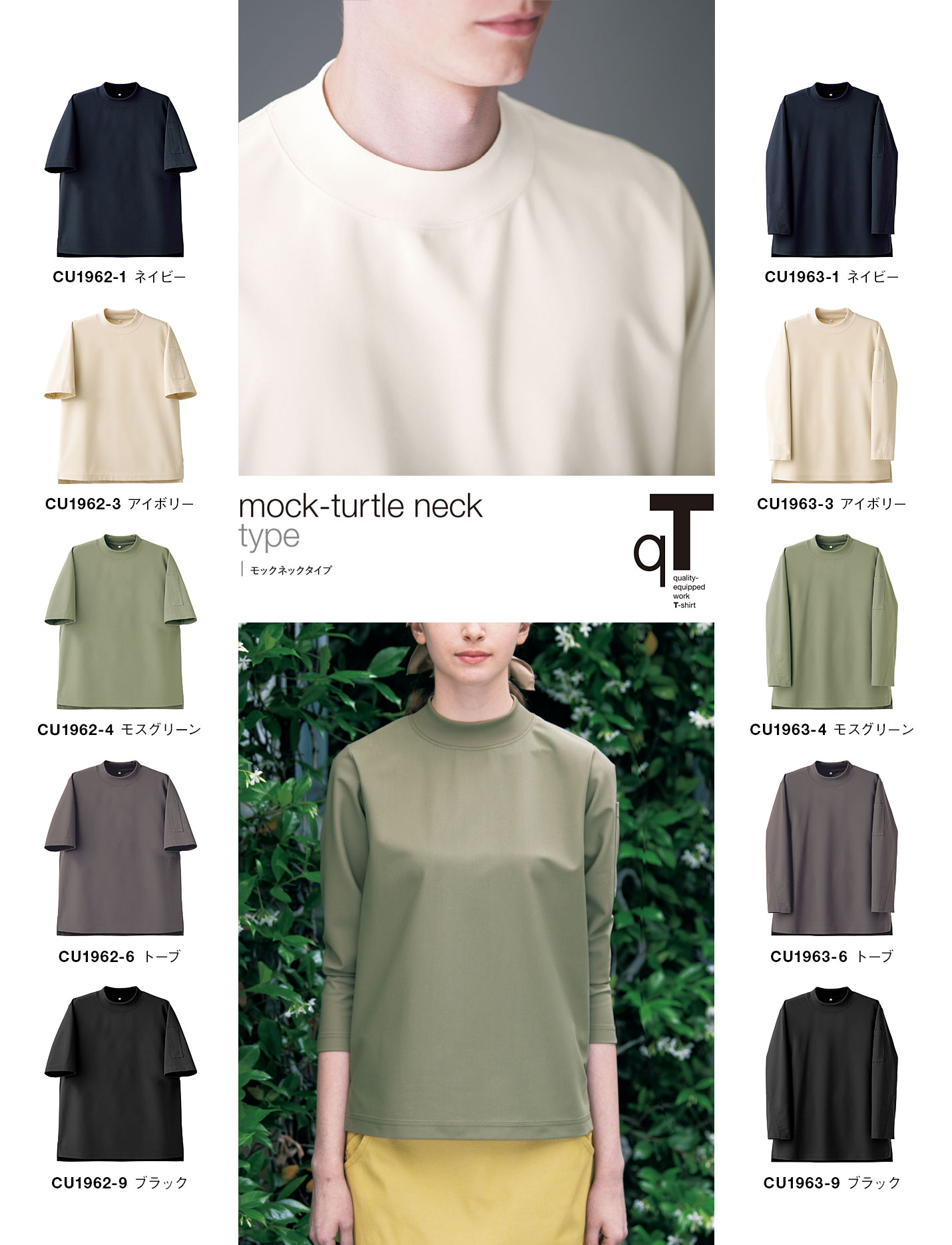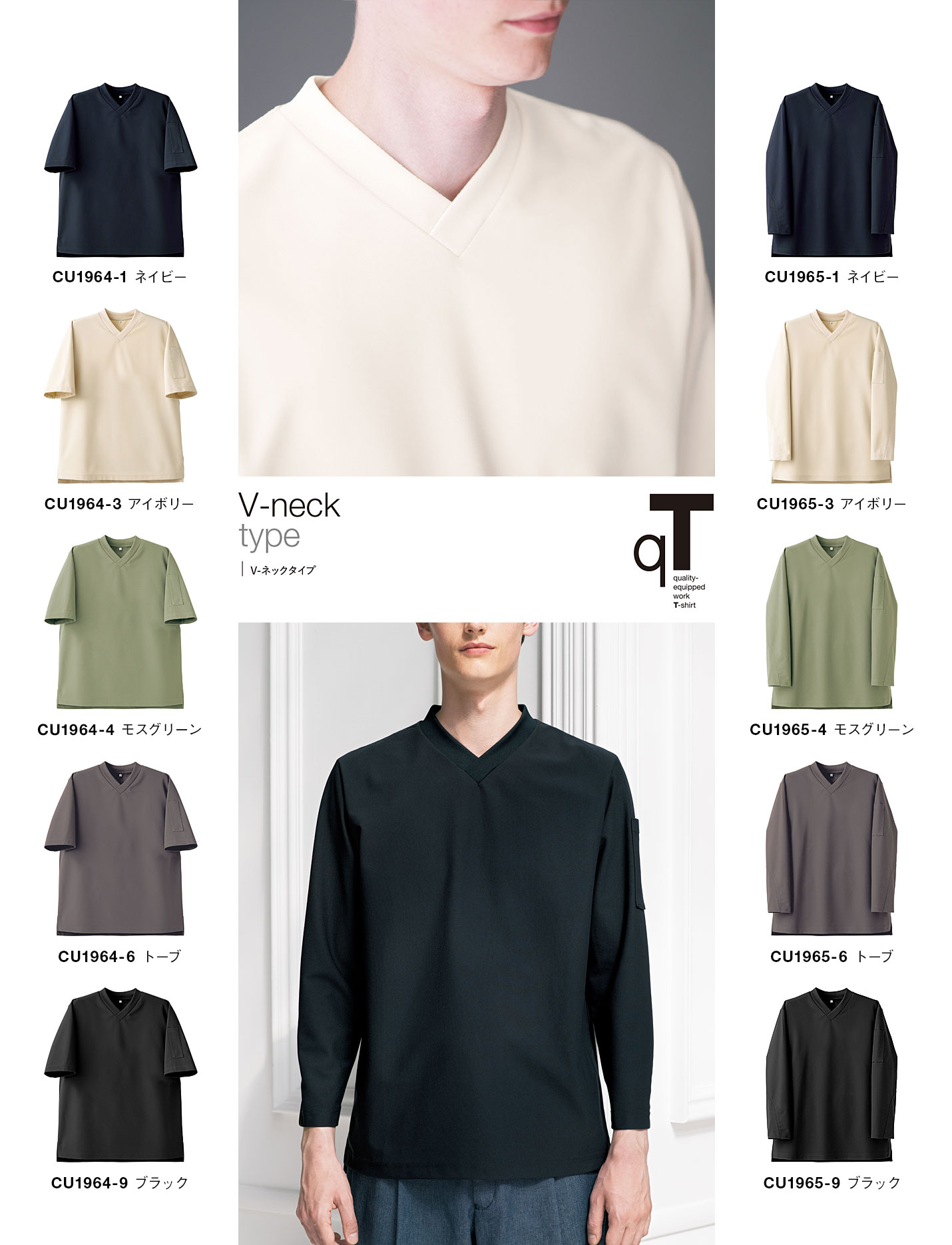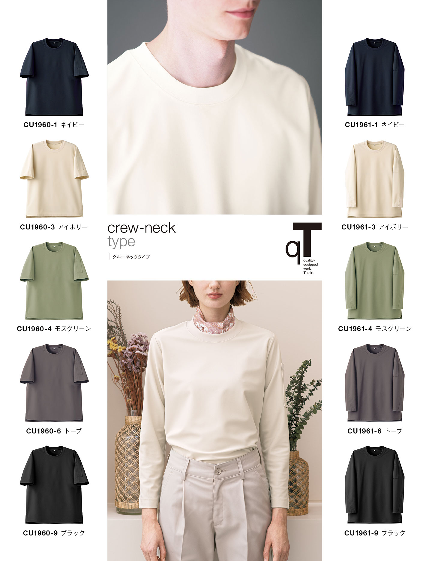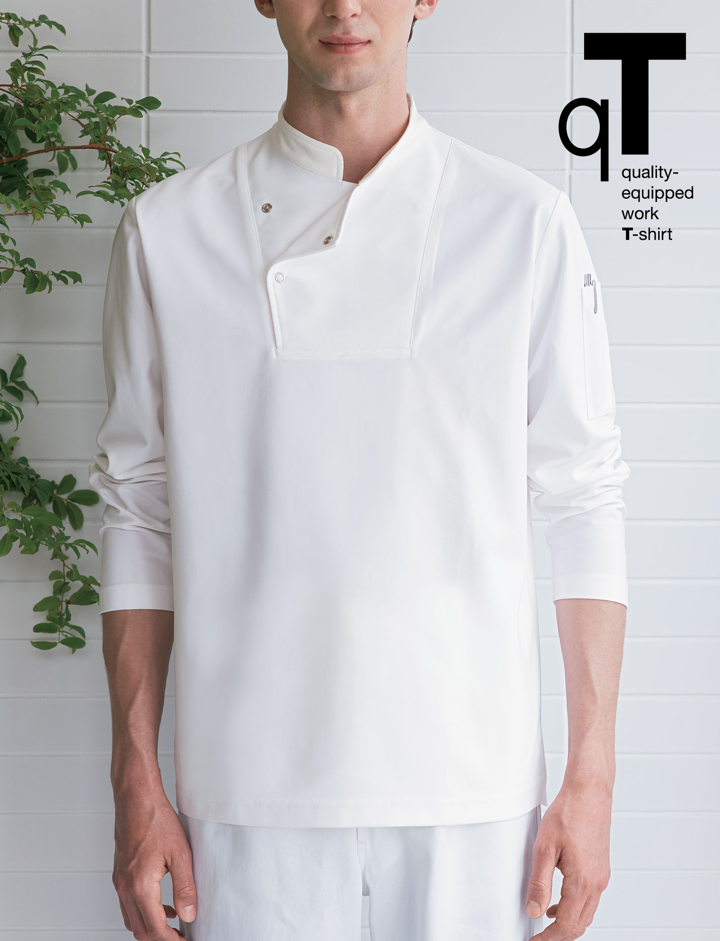 新製品「qT/quality-equipped work T-shirt」シリーズは、Tシャツが持っているシンプルで手軽なカジュアル感を活かしつつ、ホテル等で必要とされる、質の高いおもてなしに対応できる品格と清潔感を持ち、それ単体でもユニフォームとして成立するシャツをコンセプトとしてデザイン。サイズ感や生地にもこだわり、ユニフォームクオリティで最良の着心地と機能性を備えた、新しいTシャツシリーズとなりました。