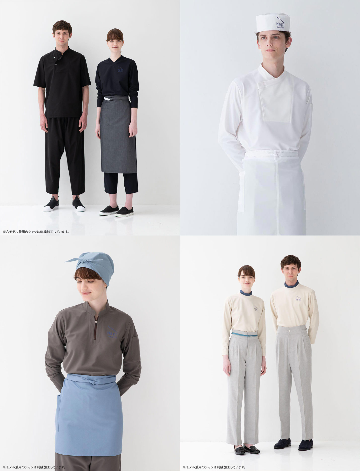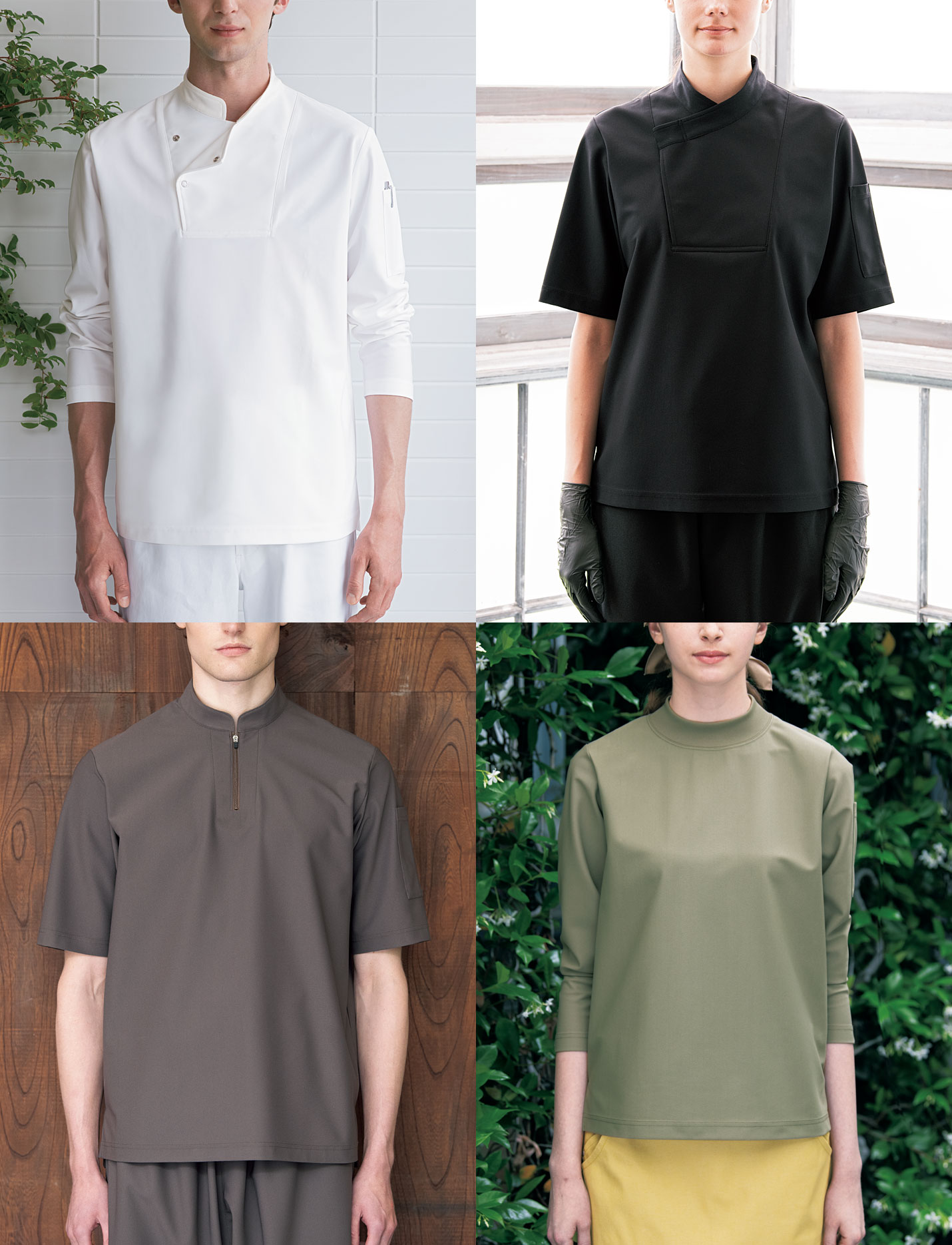 胸ポケットは無く、左袖のペン差しのみ。各ネックタイプに半袖と長袖を揃え、袖脇下にリブが配してあることで肌離れが良く脇汗が気にならない仕様になっており、機能性とシンプルさを両立。制電や耐塩素というユニフォームに欠かせない機能があるため作業性にも富み、5色のバリエーションは、リゾートや和といった場面にも馴染む落ち着きのあるナチュラルな色展開です。