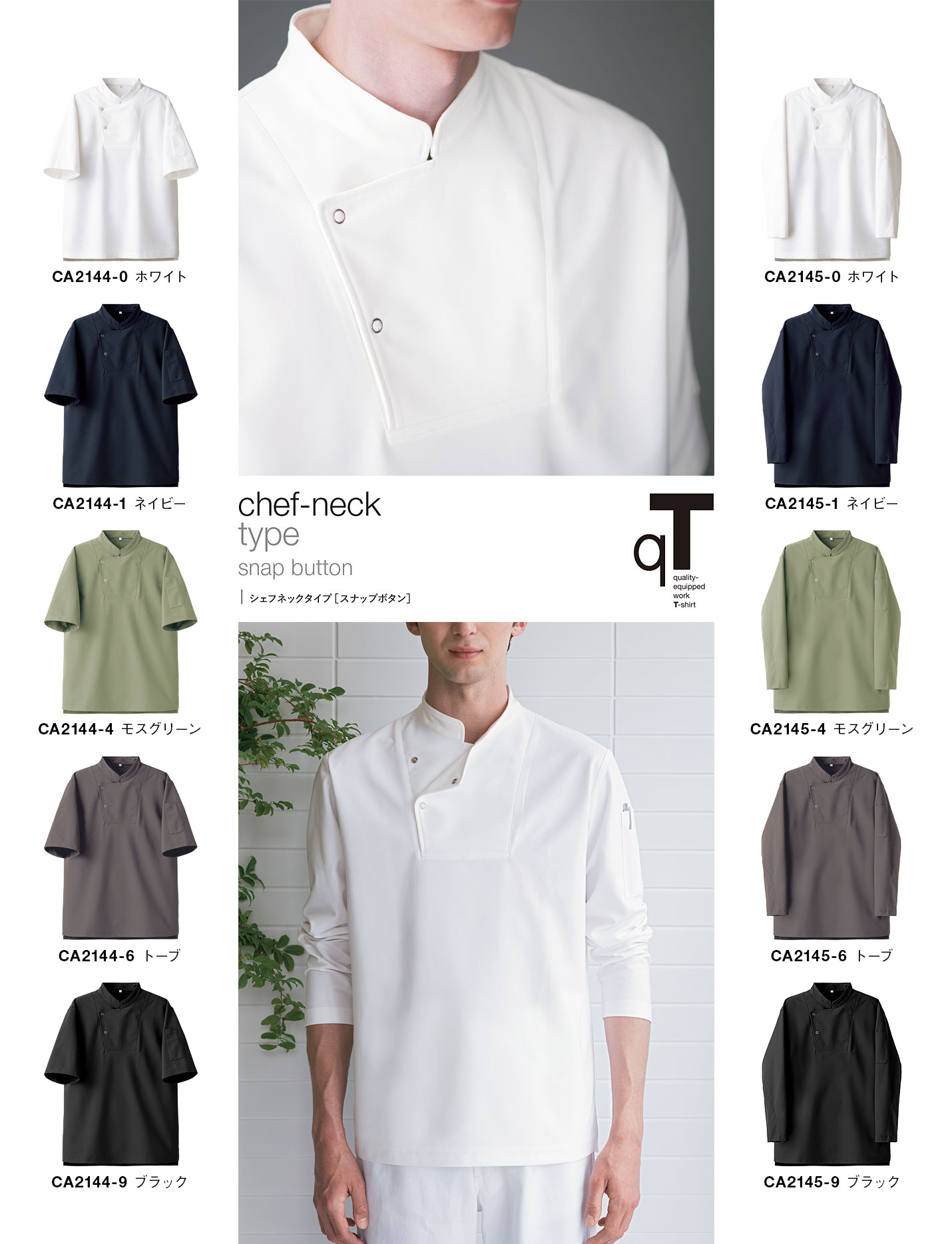 シェフ型ネックタイプのTシャツです。胸元のスナップボタンがシェフコート感を演出しています。シーンに合わせ選べる、5色のカラーと半袖・長袖をご用意しました。
