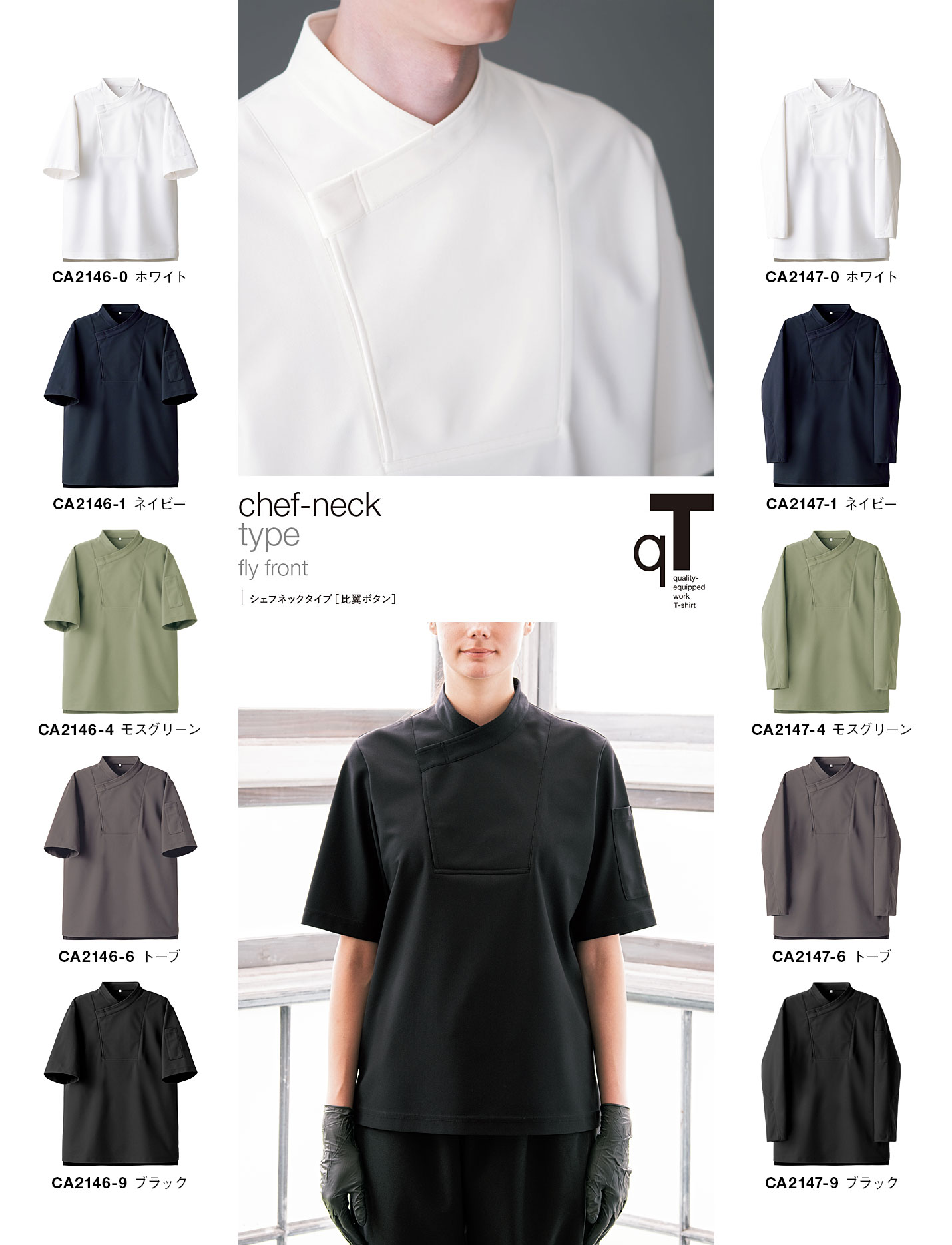 シェフ型ネックタイプのTシャツです。胸元の比翼スナップボタンがシェフコート感を演出しています。シーンに合わせ選べる、5色のカラーと半袖・長袖をご用意しました。