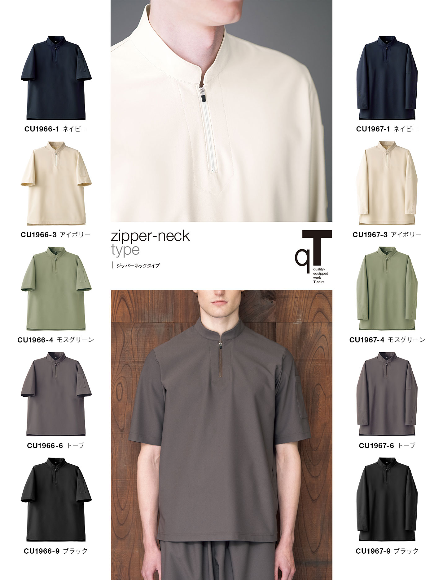 ZIP-UPスタンドカラータイプのTシャツです。胸元のジッパーが清潔なコート感を演出しています。シーンに合わせ選べる、5色のカラーと半袖・長袖をご用意しました。