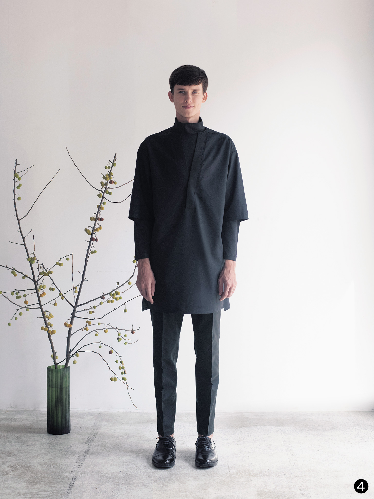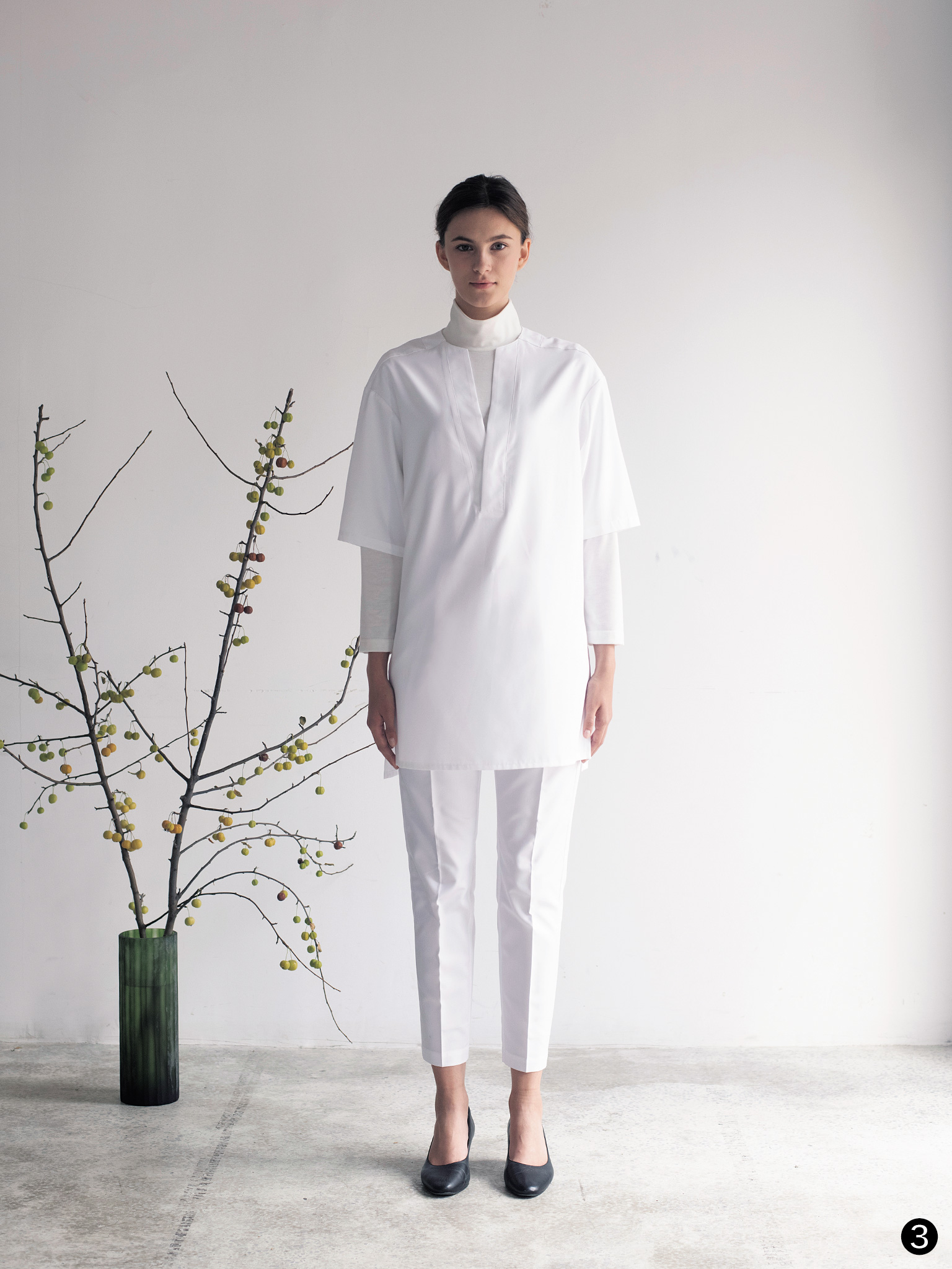 カラーは「シャツ地の7分袖シャツコート」と同じく、ホワイト(-0)、ネイビー(-1)、チャコール(-8)の3色をご用意いたしました。どれも定番の色ですが、ネイビーとチャコールは彩度を抑えた落ち着いた色味とシャツ地の滑らかさが相まってよりモダンな仕上がりとなっています。そのおかげで、ドロップショルダーでもきちんとして見えるのも特徴です。